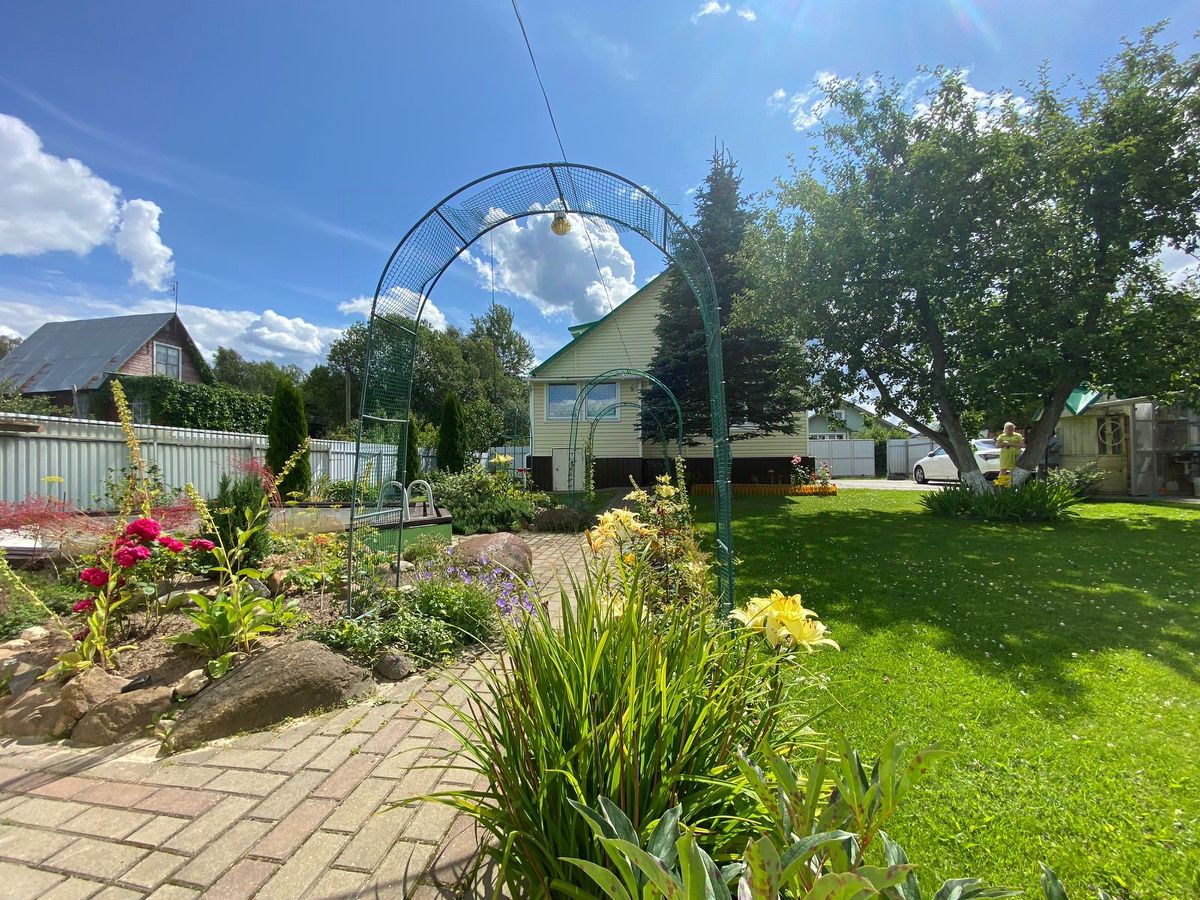 Участок ровный, правильной формы, ухожен, много плодовых и декоративных деревьев и кустарников (яблони, сливы, смородина, малина и т.д.) По всему периметру участок огорожен забором из профлиста с автоматическими откатными воротами. Ведется видеонаблюдение.