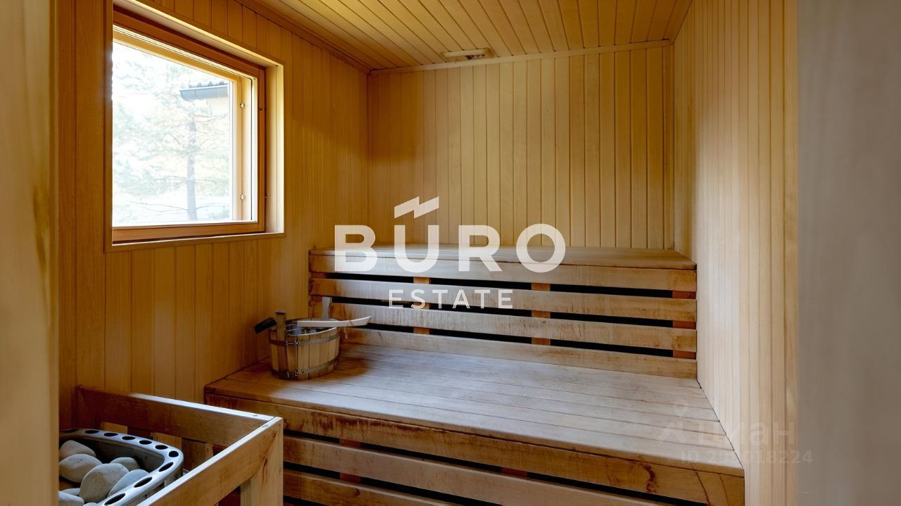 На первом этаже: гостиная, кухня-столовая, каминный зал, зона отдыха с сауной. Второй этаж полностью отдан под просторные спальни.