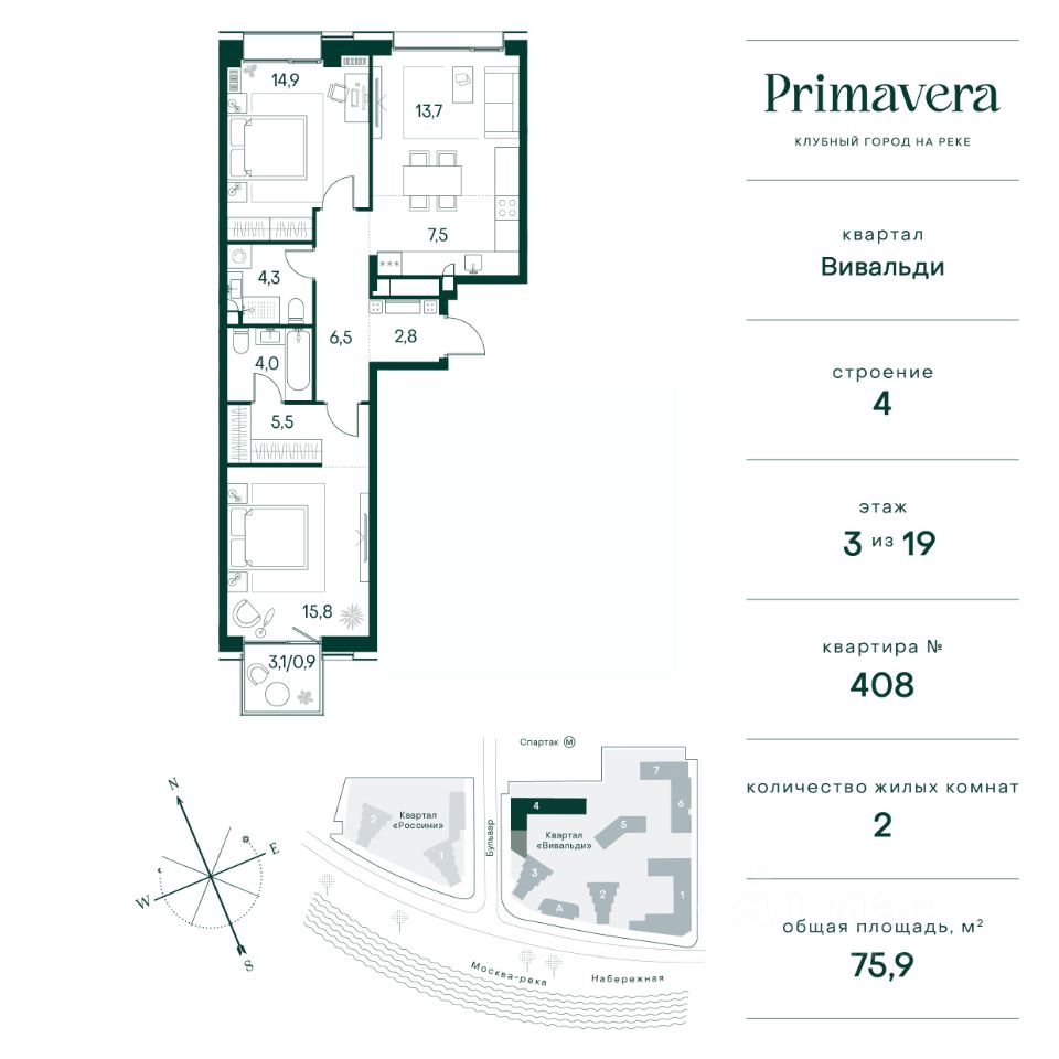 Клубный город на реке Primavera — это современный жилой комплекс премиум-класса, расположенный на первой береговой линии Москвы-реки в экологически чистом районе Покровское-Стрешнево.