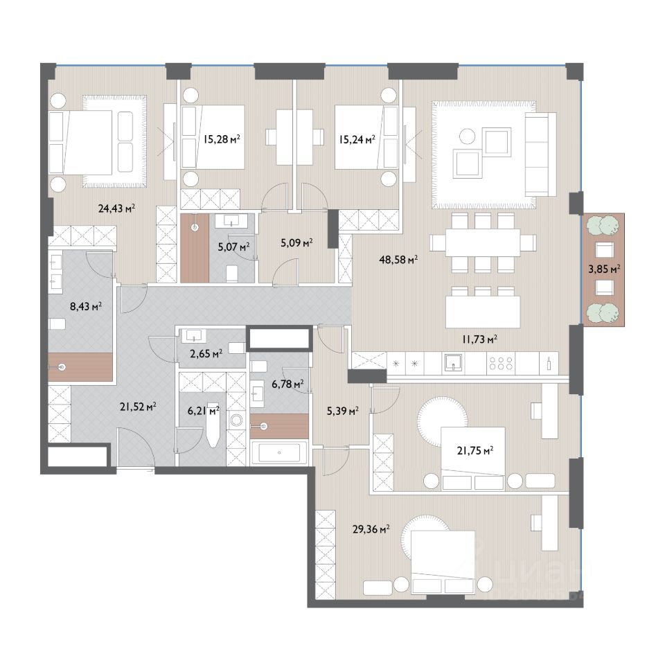 Квартира с готовой дизайнерской отделкой, кухней с островом и встроенной техникой. Отделка премиум-класса: Valcucine, Siematic, V-Zug, Gessi, Antoniolupi, iGuzzini.