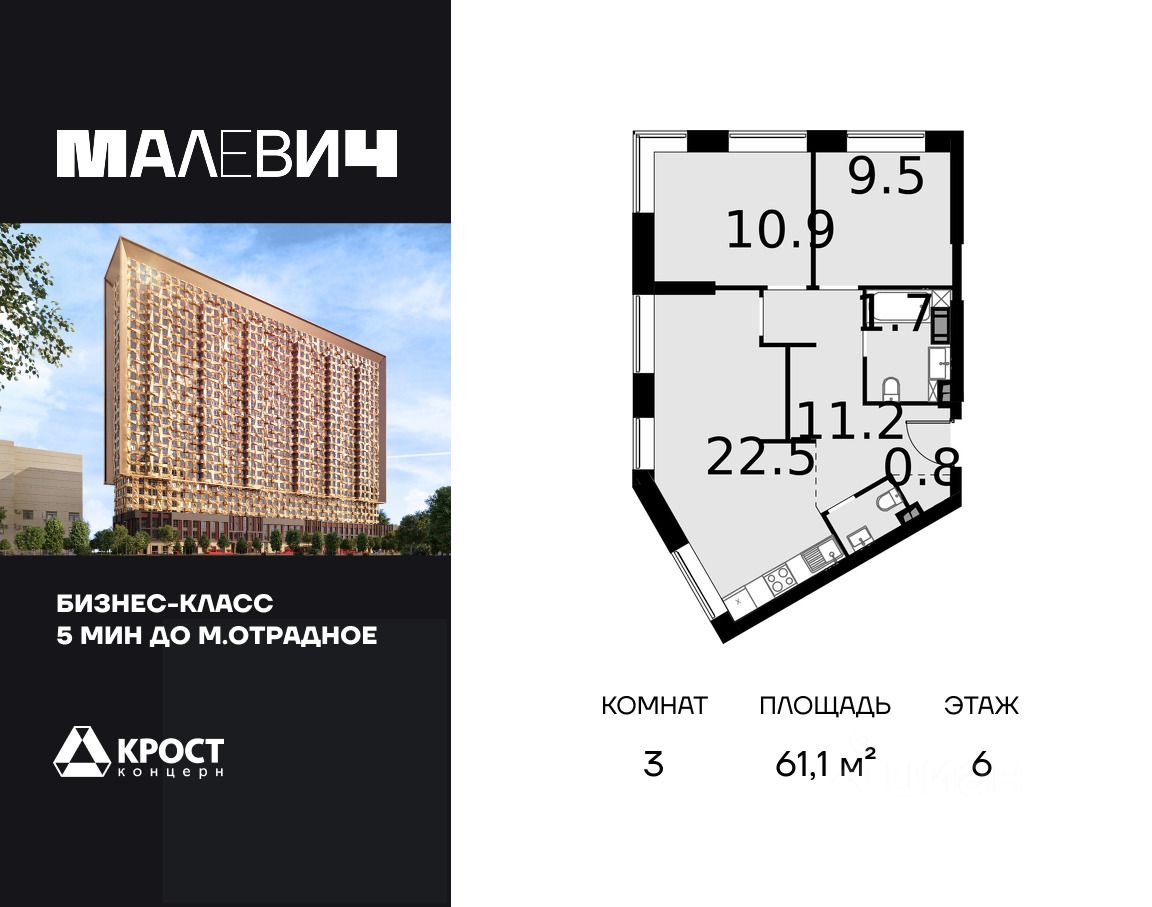Продаётся 3-к апартаменты 61.1 кв.м. на 6-м этаже 28 этажного дома. Без отделки. Срок сдачи: 1 кв. 2026 г.
