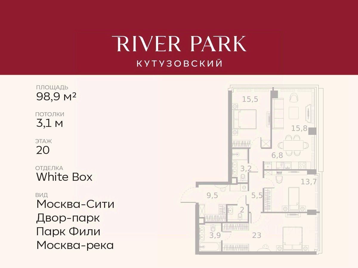 Расположение и Транспортная доступность: - На берегу Москвы-реки, напротив Москва-Сити - 600 метров до Кутузовского проспекта - Удобный съезд с ТТК - Прямой выезд на МКАД по Северному дублеру Кутузовского проспекта. - В пешей доступности 3 станции метро: Фили, Парк Победы, Кутузовская, а также станция МЦД Фили. Архитектура от именитого бюро ADM отличается уникальной пластикой фасадов - башни словно парят в воздухе, играя гранями как драгоценные камни. Жилой комплекс состоит из 5-ти небоскребов с home park на закрытой территории и внешней торговой галереей с открытым доступом.