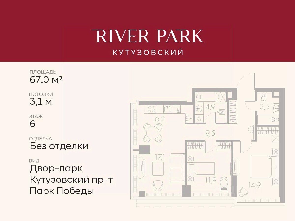 Расположение и Транспортная доступность: - На берегу Москвы-реки, напротив Москва-Сити - 600 метров до Кутузовского проспекта - Удобный съезд с ТТК - Прямой выезд на МКАД по Северному дублеру Кутузовского проспекта. - В пешей доступности 3 станции метро: Фили, Парк Победы, Кутузовская, а также станция МЦД Фили. Архитектура от именитого бюро ADM отличается уникальной пластикой фасадов - башни словно парят в воздухе, играя гранями как драгоценные камни. Жилой комплекс состоит из 5-ти небоскребов с home park на закрытой территории и внешней торговой галереей с открытым доступом.