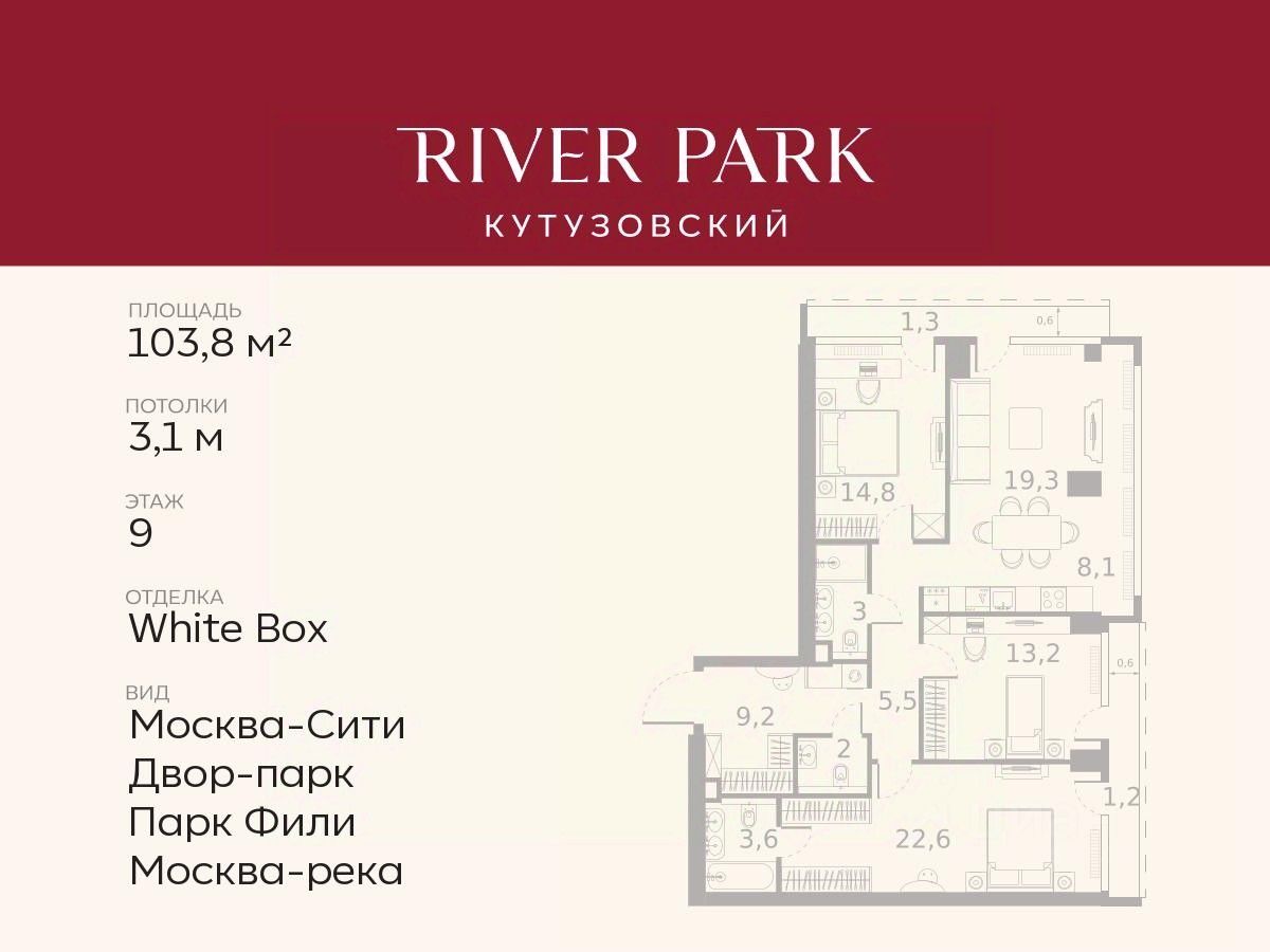 Расположение и Транспортная доступность: - На берегу Москвы-реки, напротив Москва-Сити - 600 метров до Кутузовского проспекта - Удобный съезд с ТТК - Прямой выезд на МКАД по Северному дублеру Кутузовского проспекта. - В пешей доступности 3 станции метро: Фили, Парк Победы, Кутузовская, а также станция МЦД Фили. Архитектура от именитого бюро ADM отличается уникальной пластикой фасадов - башни словно парят в воздухе, играя гранями как драгоценные камни. Жилой комплекс состоит из 5-ти небоскребов с home park на закрытой территории и внешней торговой галереей с открытым доступом.