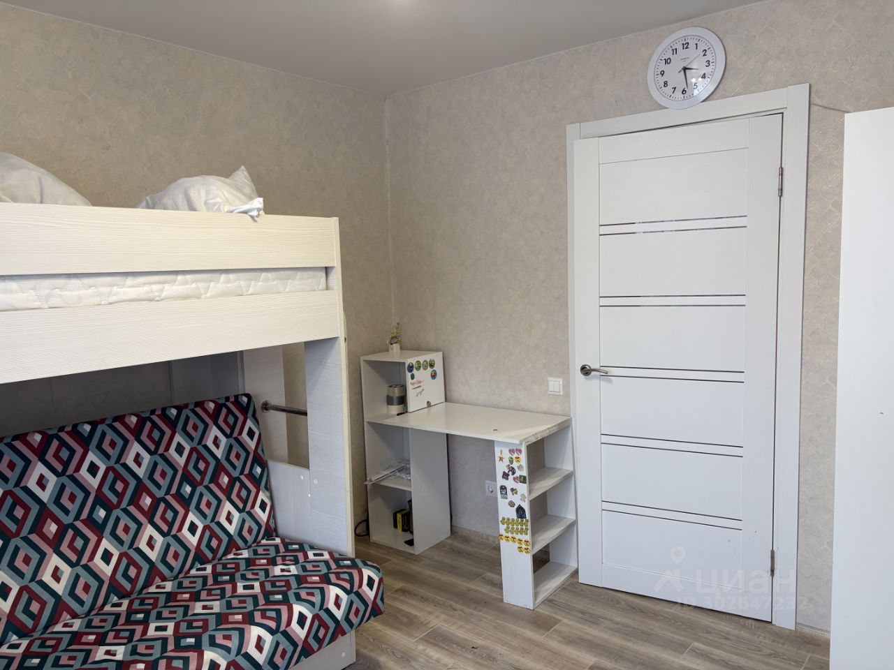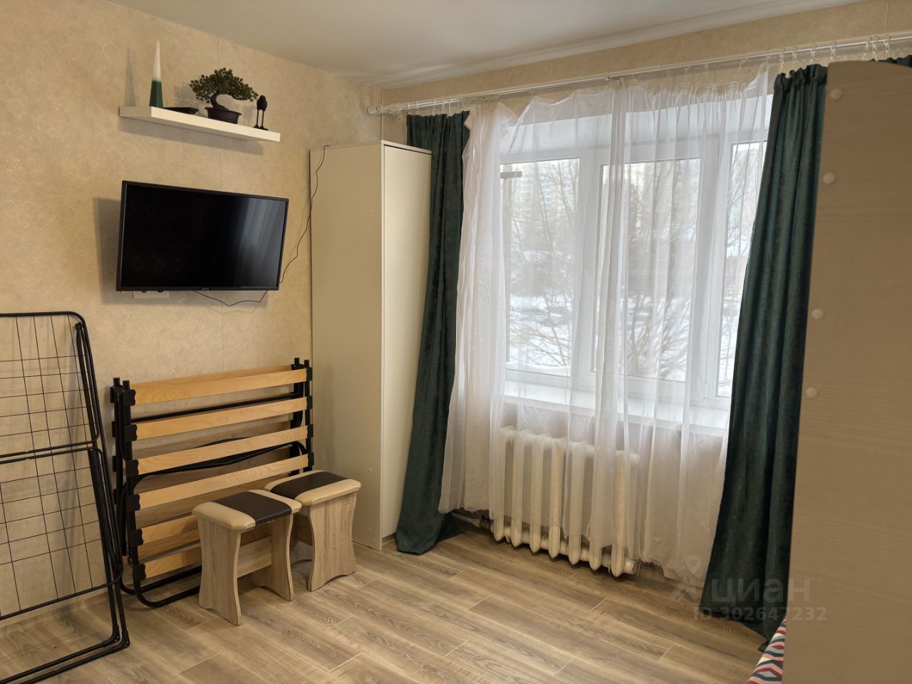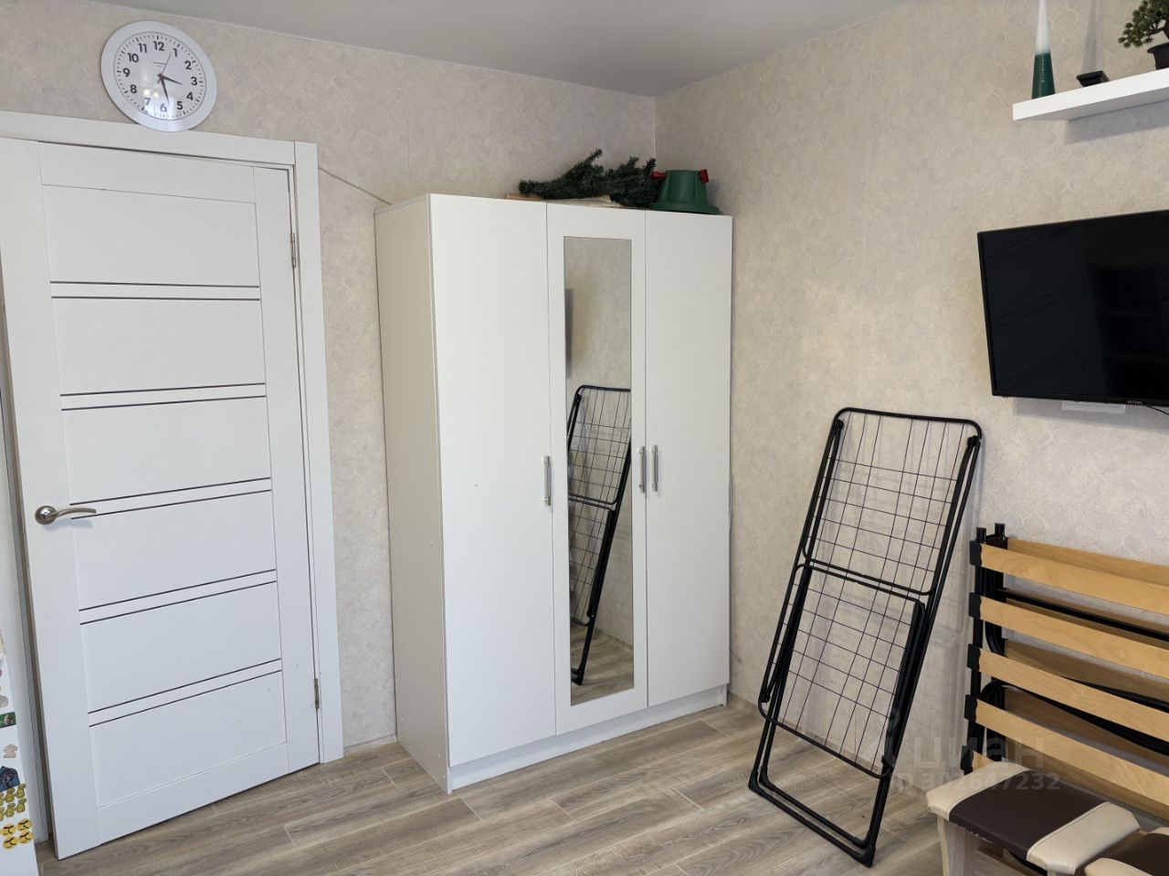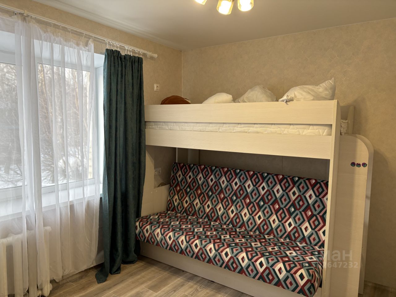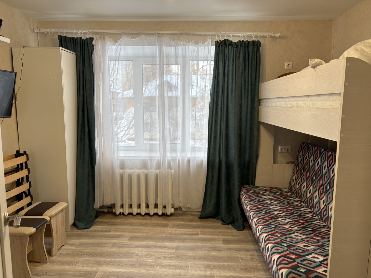 двухъярусная кровать сверху спальное место, внизу раскладывается диван. есть еще раскладушка. шкаф для мебели. телевизор , холодильник, плита имеется.