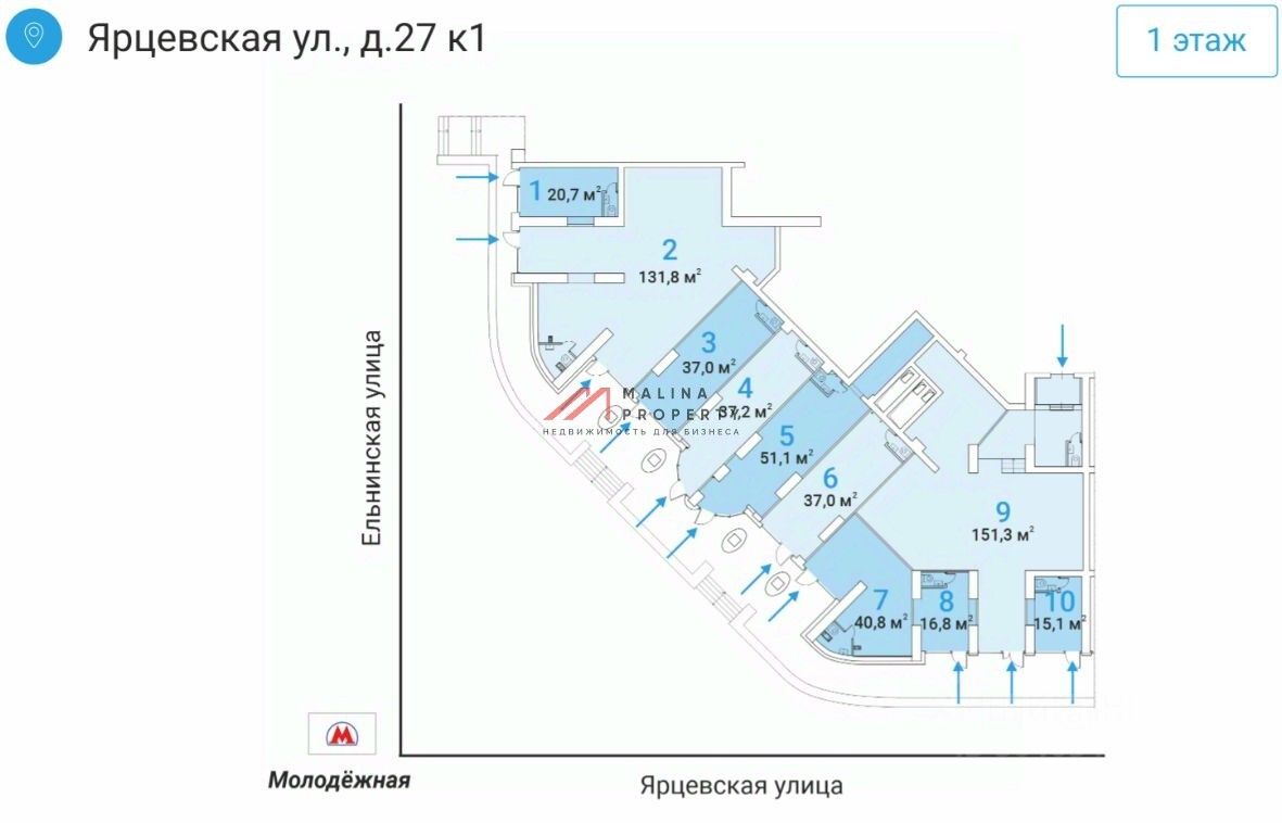 Продажа торгового помещения 51,1 м2 на Ярцевской улице, д.27 корпус 1 (1 минута пешком от метро Молодёжная).