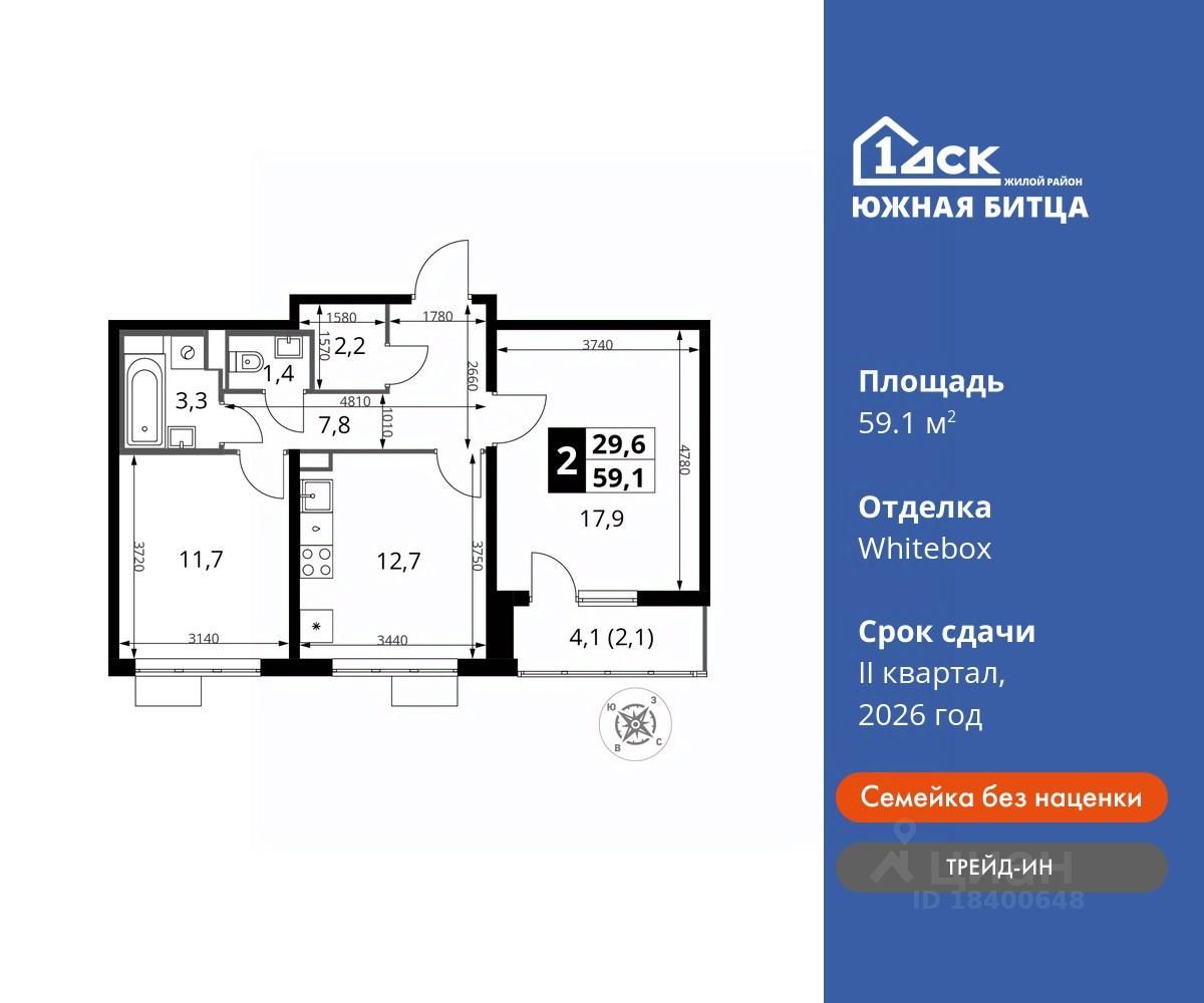 Максимальные скидки при 100% оплате. Ипотека для всех! Своя квартира от 60 600 руб/мес Прямая продажа от застройщика! Семейный жилой район класса Комфорт Плюс Продаётся 2-к квартира номер 604 общей площадью 59.1 кв.м на 18-м этаже 22 этажного дома. Отделка Whitebox.