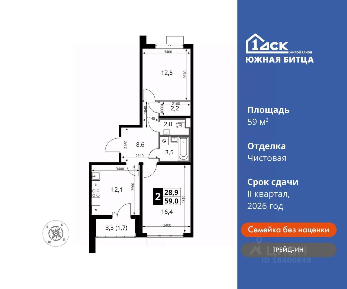 продам 2-к, Южная Битца ЖК, 1016 402 000 ₽