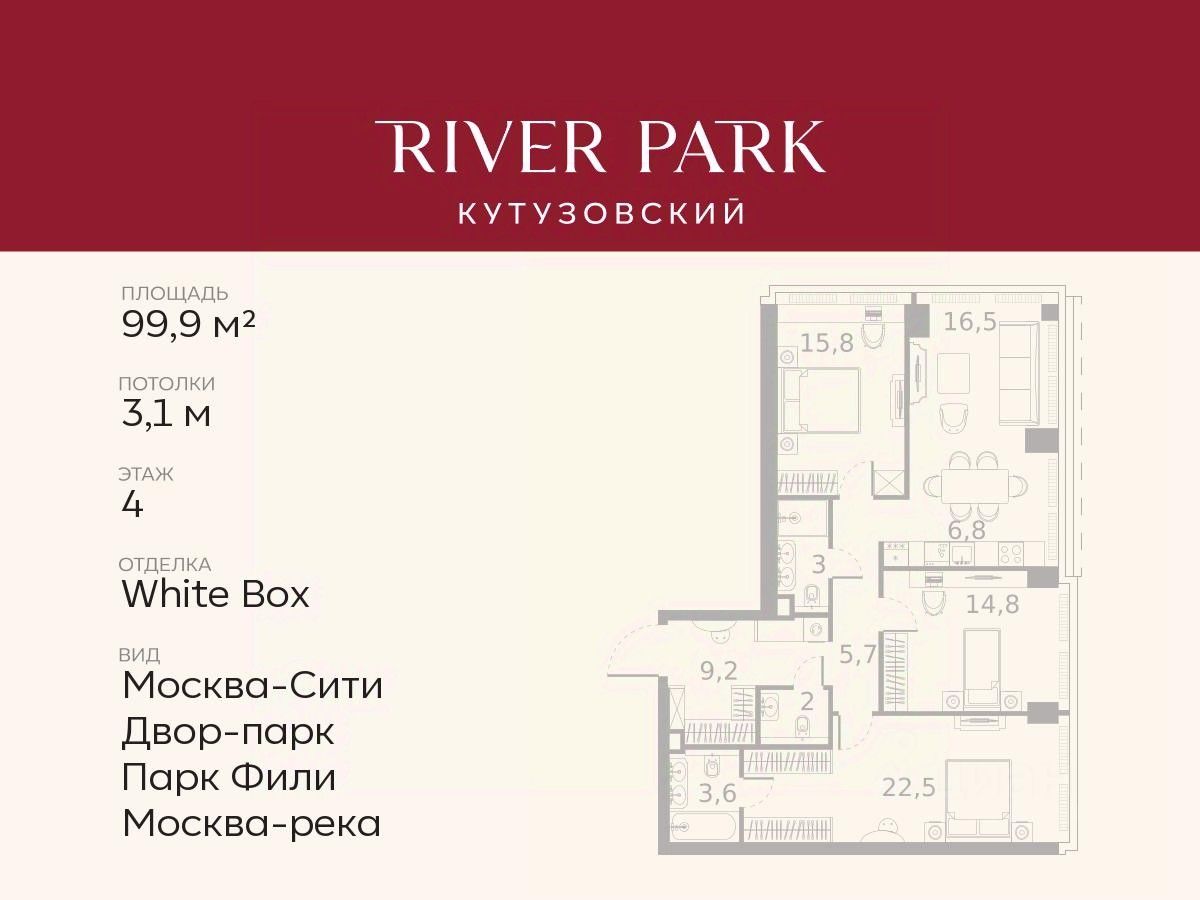 Расположение и Транспортная доступность: - На берегу Москвы-реки, напротив Москва-Сити - 600 метров до Кутузовского проспекта - Удобный съезд с ТТК - Прямой выезд на МКАД по Северному дублеру Кутузовского проспекта. - В пешей доступности 3 станции метро: Фили, Парк Победы, Кутузовская, а также станция МЦД Фили. Архитектура от именитого бюро ADM отличается уникальной пластикой фасадов - башни словно парят в воздухе, играя гранями как драгоценные камни. Жилой комплекс состоит из 5-ти небоскребов с home park на закрытой территории и внешней торговой галереей с открытым доступом.