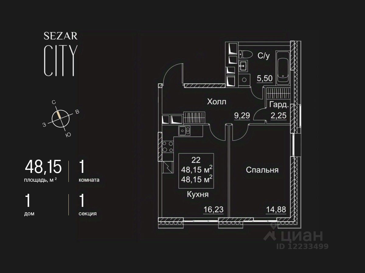 Продается 1-комнатная квартира в ЖК SEZAR CITY на 6 этаже. Общая площадь квартиры составляет 48,15 кв.м. Квартира без отделки. Срок сдачи - 2027 год.