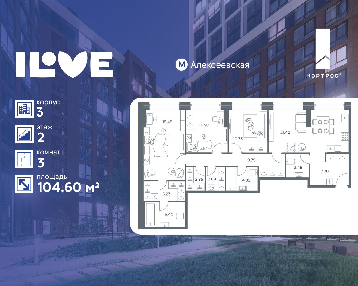 Продаётся 3-комнатная квартира общей площадью 104.60 кв. м на 2 этаже жилого квартала бизнес-класса iLove. Без отделки, 2 санузла. Мастер-спальня с гардеробной. Просторная кухня-гостиная. Ниша для гардеробной. Окна в квартире выходят на одну сторону Вид: • во двор.