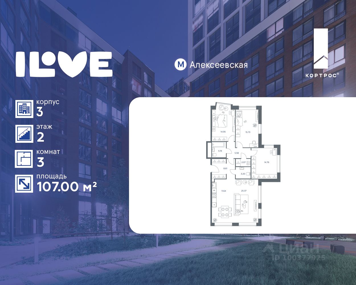 Продаётся 3-комнатная квартира общей площадью 107.00 кв. м на 2 этаже жилого квартала бизнес-класса iLove. Без отделки, 2 санузла. Мастер-спальня с гардеробной. Просторная кухня-гостиная. Ниша для гардеробной. Окна в квартире выходят на разные стороны Вид: • во двор.