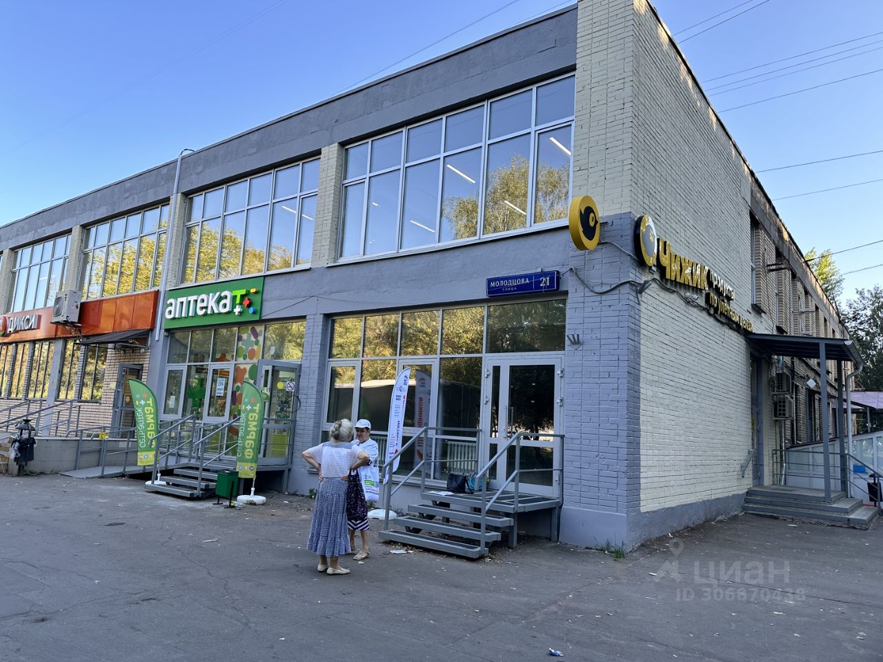 Три входа. Два отдельных входа с улицы, один со стороны лестницы на второй этаж, где располагается продуктовый дискаунтер ''Чижик''.