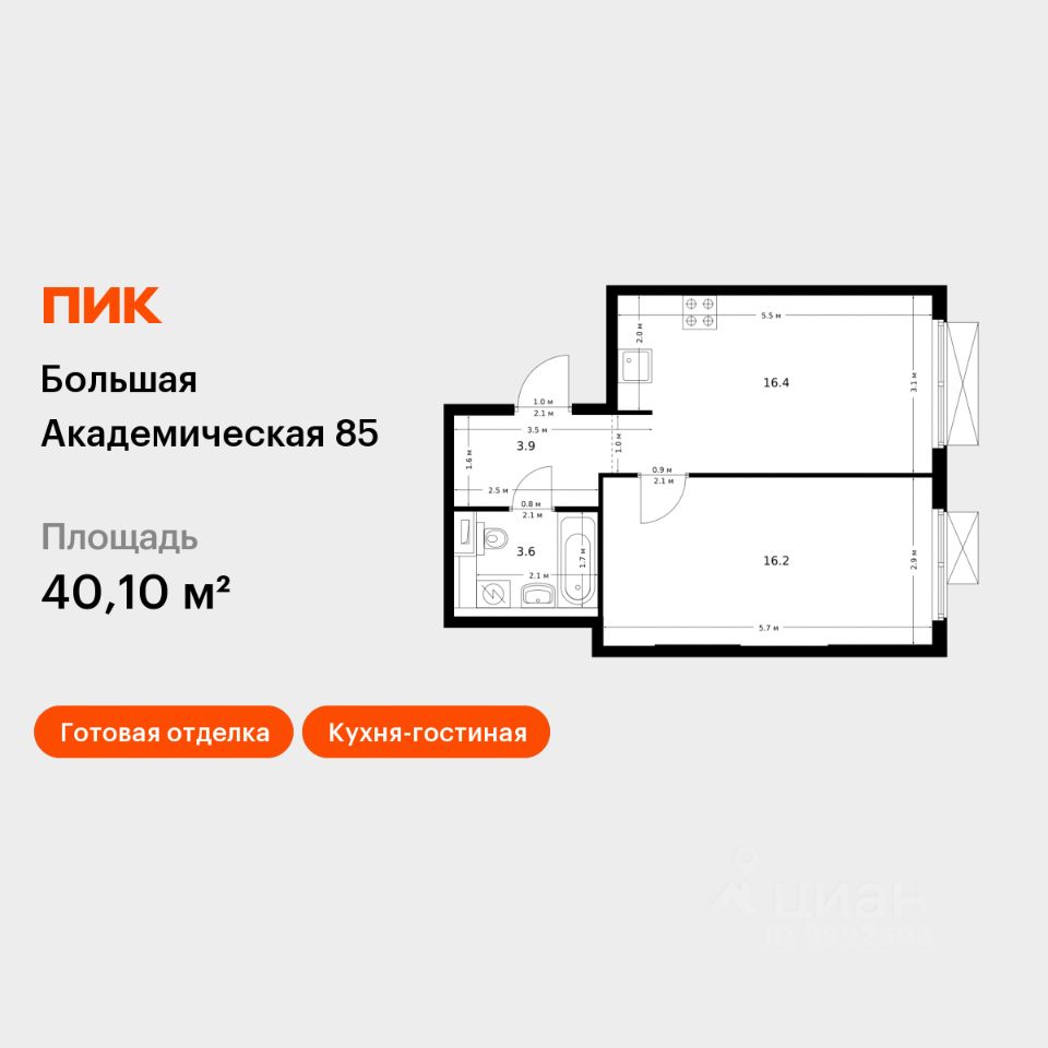 Продаётся 1-комн. квартира площадью 40,1 кв.м на 2 этаже 19 этажного дома (Корпус 3.1, Секция 1) проекта ПИК Большая Академическая 85. Светлый просторный подъезд на уровне земли, функциональная планировка, большие окна, c отделкой.