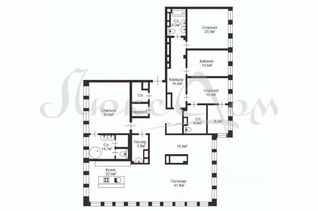 На данном этапе СПЛАНИРОВАНО: большая гостевая зона с кухней и столовой, мастер-спальня с с/у и гардеробной, 2 детские спальни, каждая - с с/у и гардеробной, кабинет/спальня, гостевой с/у, постирочная, гардеробная.