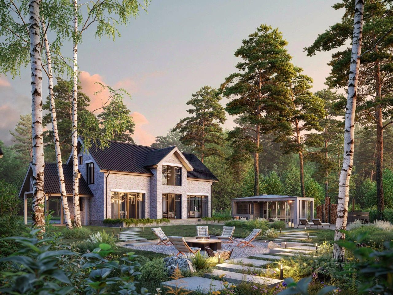 Уютный дом 88 площадью 150 кв. м. на участке 7 соток. Просторная планировка, современные материалы и панорамные окна.