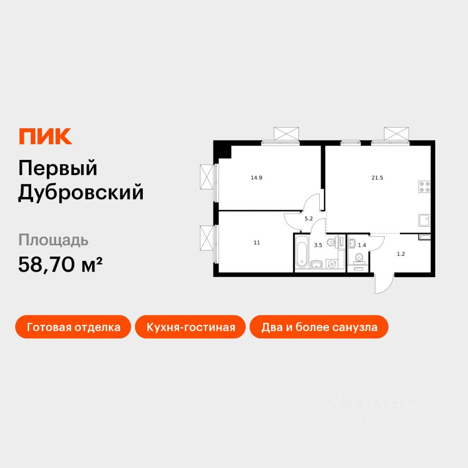 Продаётся 2-комн. квартира площадью 58,7 кв.м на 2 этаже 28 этажного дома (Корпус 1.2, Секция 2) проекта ПИК Первый Дубровский. Светлый просторный подъезд на уровне земли, функциональная планировка, большие окна, c отделкой.