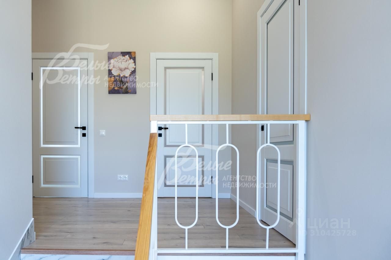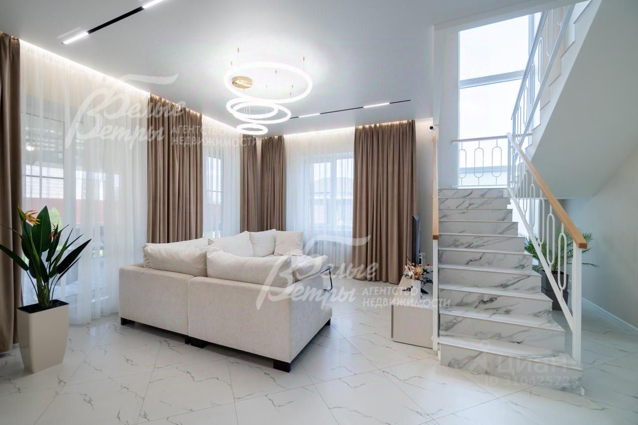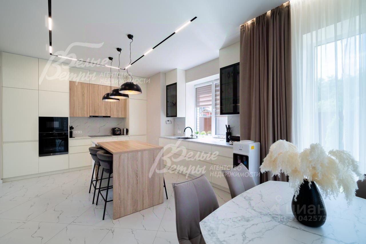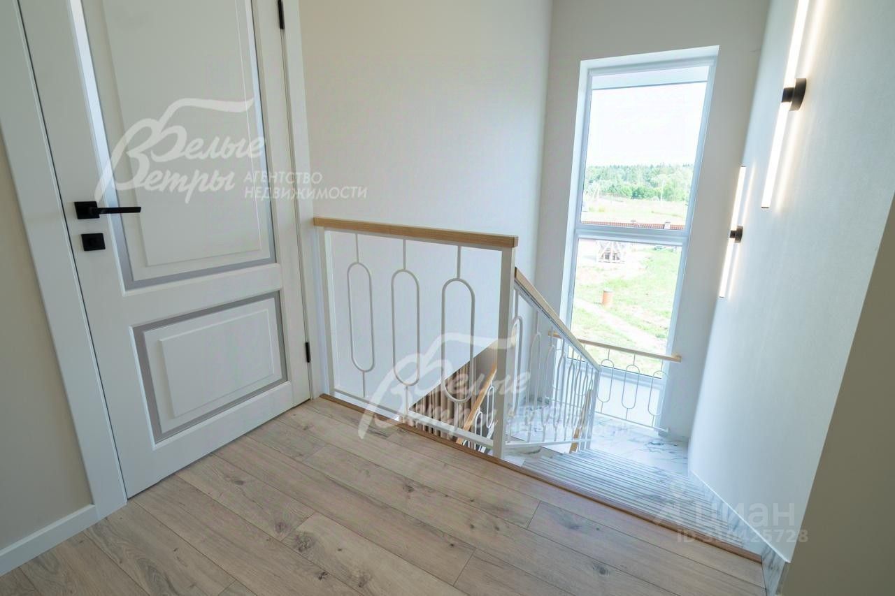 Описание внутренней отделки: выполнена отделка в современном стиле минимализм в светлых матовых тонах. На стенах обои (зарубежные) и краска. На полу ламинат, керамогранит. Монолитная лестница отделана керамогранитом (ширина 1 метр). Натяжные потолки с разными сценариями освещения (более 7 сценариев в каждой комнате). Установлена вся сантехника: унитазы CRETO (Италия), инсталляции AM PM (Германия), раковина Melana (на 1 этаже). На первом этаже везде теплый пол (водяной), на 2 этаже - в санузлах. Электрика АВВ. Межкомнатные двери скрытого монтажа. Встроенная система для обуви PULSE..