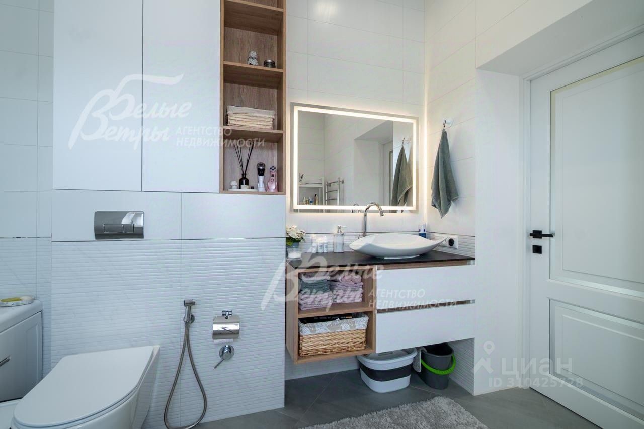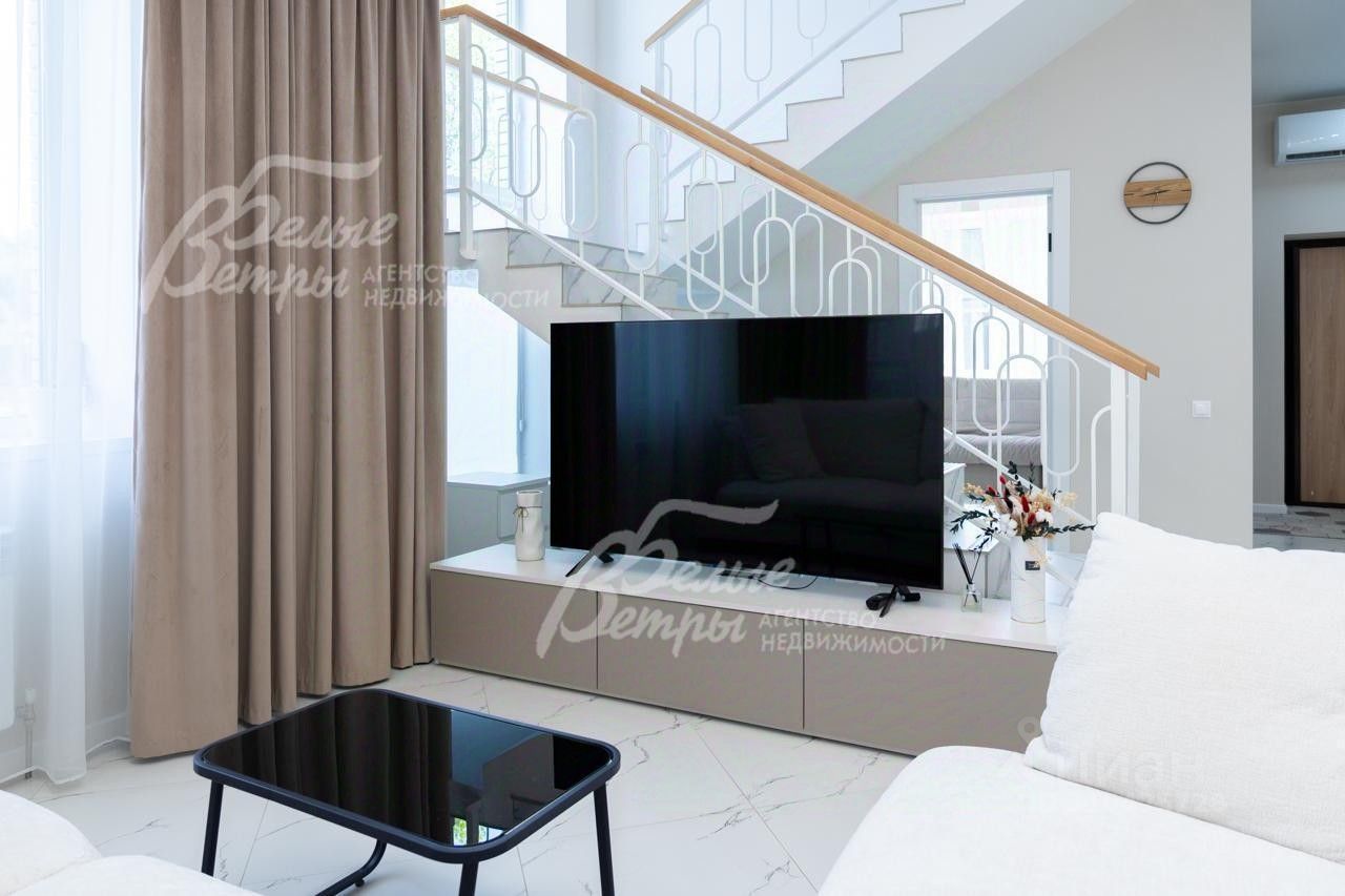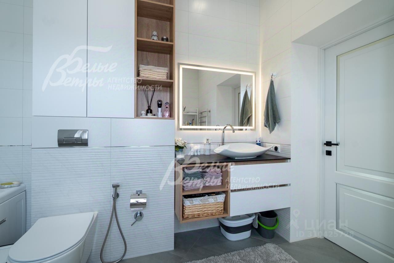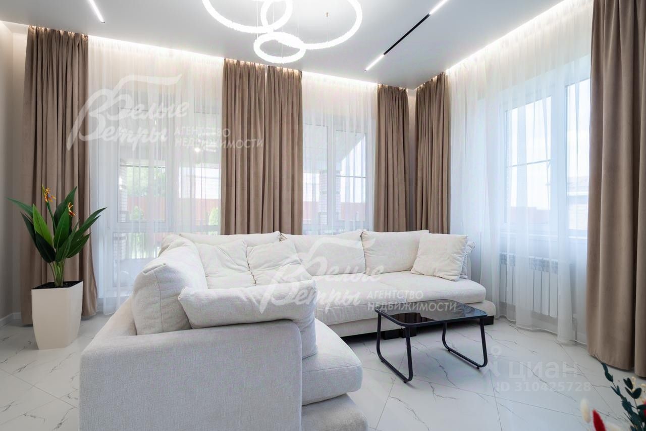 Описание внутренней отделки: выполнена отделка в современном стиле минимализм в светлых матовых тонах. На стенах обои (зарубежные) и краска. На полу ламинат, керамогранит. Монолитная лестница отделана керамогранитом (ширина 1 метр). Натяжные потолки с разными сценариями освещения (более 7 сценариев в каждой комнате). Установлена вся сантехника: унитазы CRETO (Италия), инсталляции AM PM (Германия), раковина Melana (на 1 этаже). На первом этаже везде теплый пол (водяной), на 2 этаже - в санузлах. Электрика АВВ. Межкомнатные двери скрытого монтажа. Встроенная система для обуви PULSE..