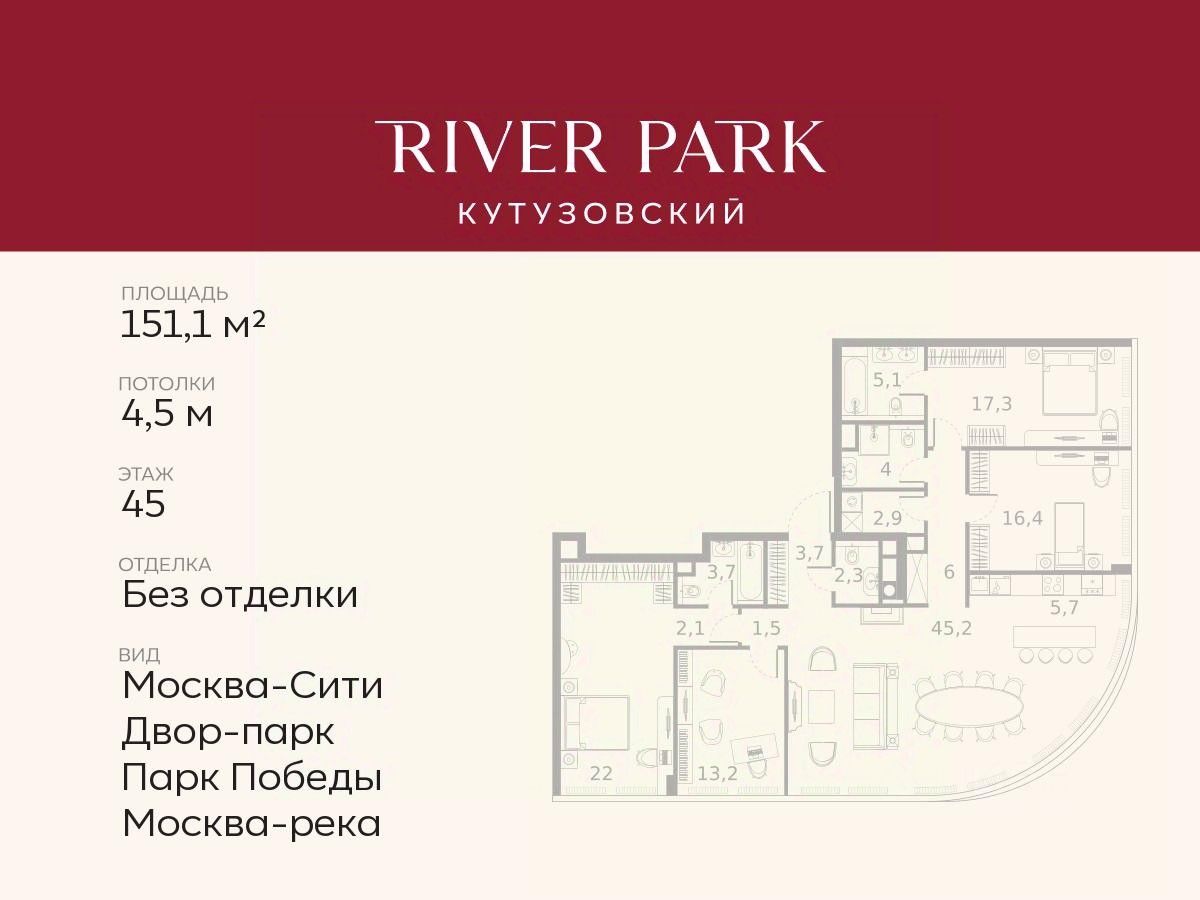 Продается 4-к квартира площадью 151.1 кв.м. на 45-м этаже в жилом комплексе премиум-класса River Park Кутузовский в Башне Topaz Tower
