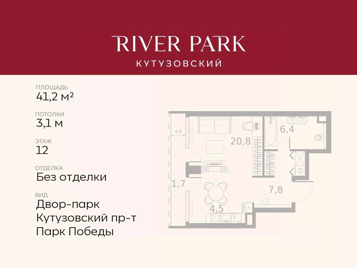 Продается студия площадью 41.2 кв.м. на 12-м этаже в жилом комплексе премиум-класса River Park Кутузовский в Башне Amber Tower