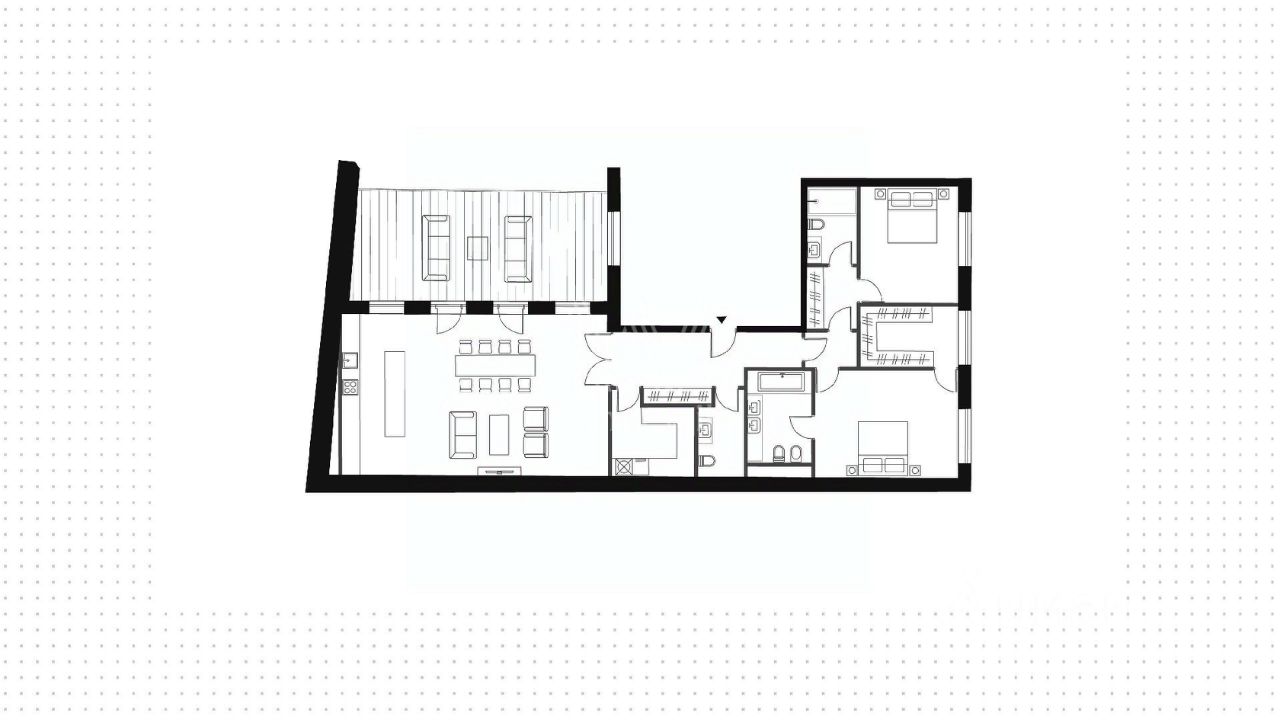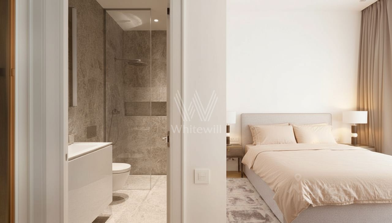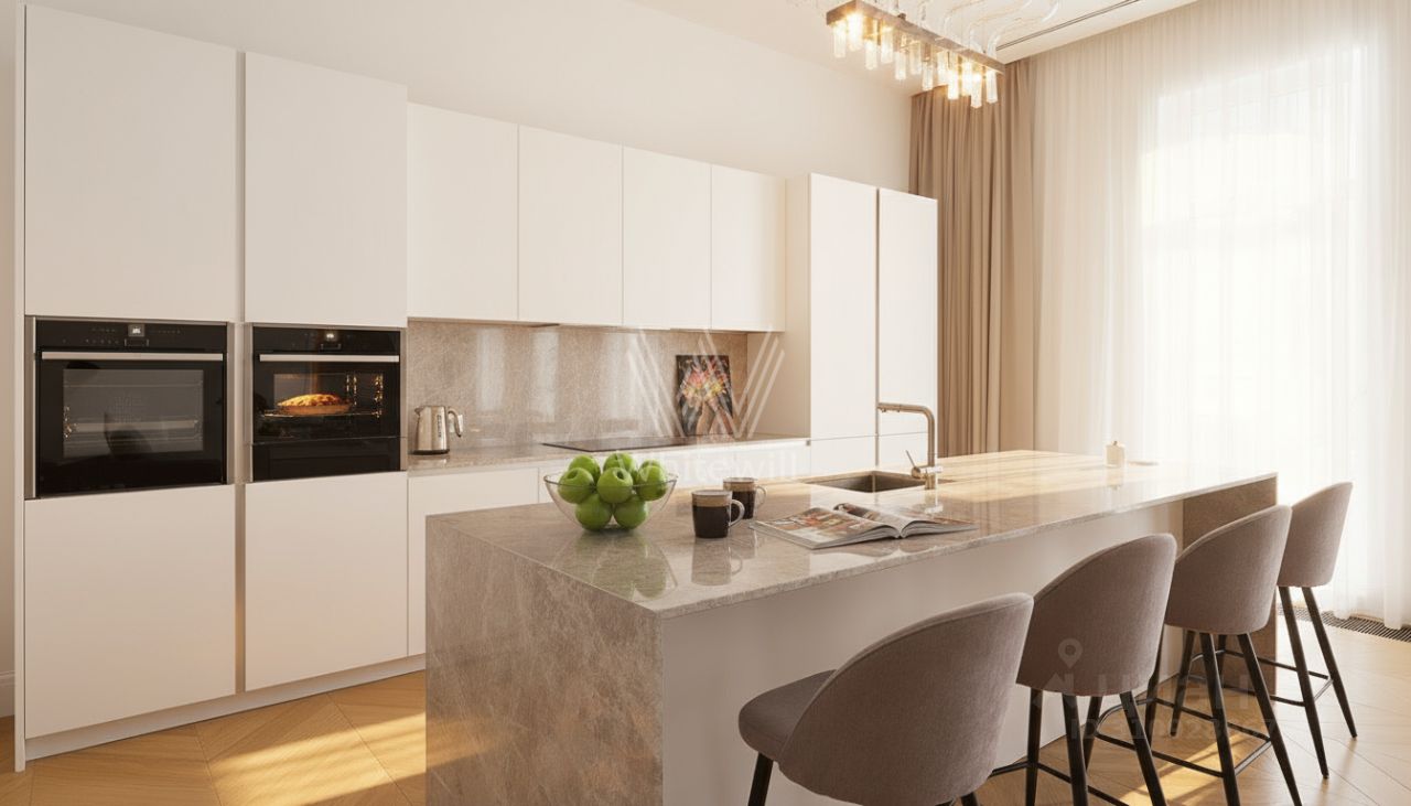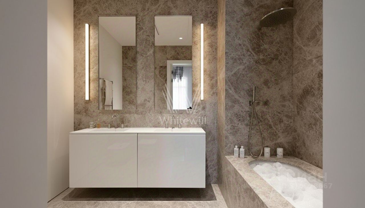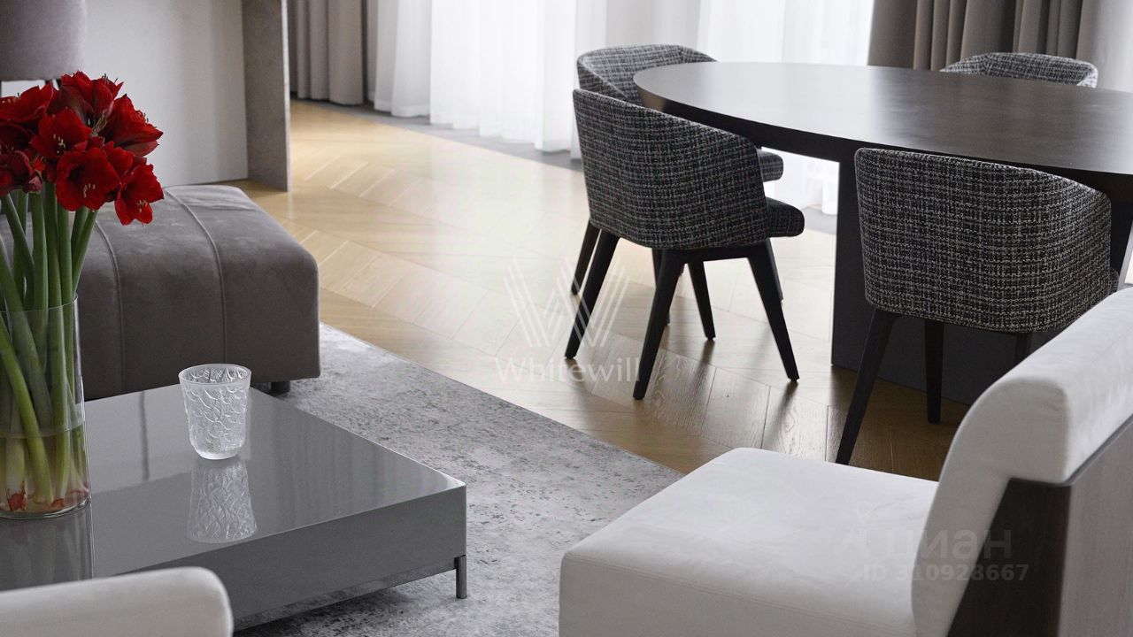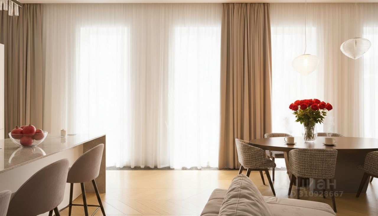 Планировочное решение: кухня-гостиная 60 м² с выходом на террасу с подогревом, ориентированную во внутренний благоустроенный двор — пространство для вечеров с семьёй, приёмов гостей и летних завтраков на свежем воздухе. Мастер-спальня с гардеробной комнатой с окном и отдельным санузлом, вторая спальня с собственным санузлом, гостевой санузел, постирочная и холл.