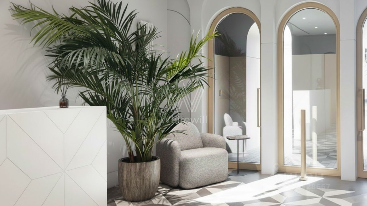 Главное о доме. Cloud Nine — ансамбль клубных домов на Золотой Миле с камерным составом резиденций. Архитектура сочетает восстановленные особняки и современные объёмы в светлом камне и стекле, французские окна и террасы выводят на зелень внутреннего сада. В лобби — натуральный камень, латунные детали, мягкий свет, стойка ресепшн и небольшие зоны для встреч. Во дворе сделали тихий сад без машин с вечерней подсветкой. На верхних уровнях встречаются пентхаусы с террасами. На первых этажах — повседневные сервисы, паркинг связывается с корпусами лифтами.