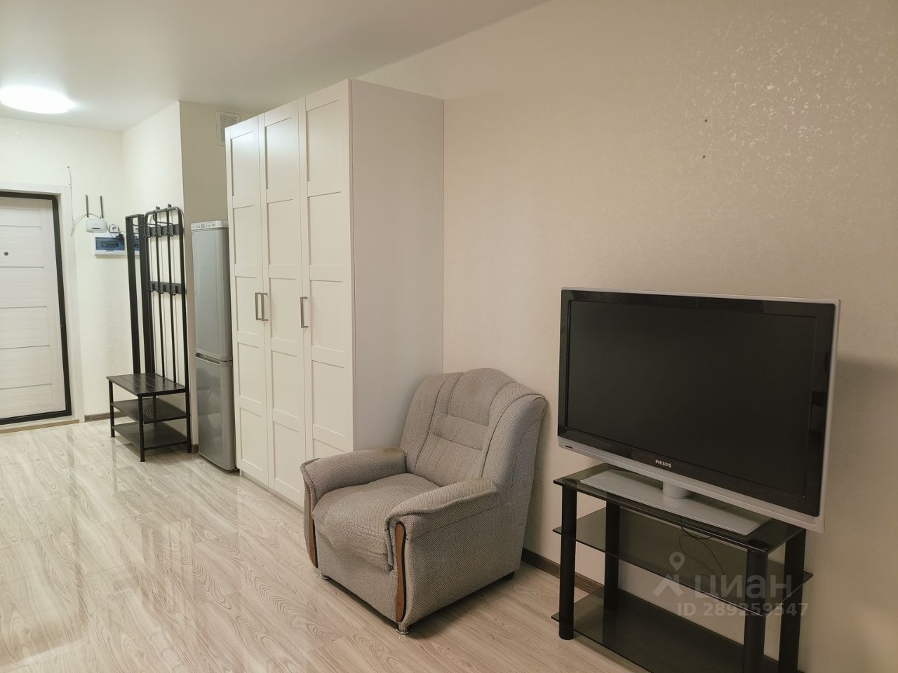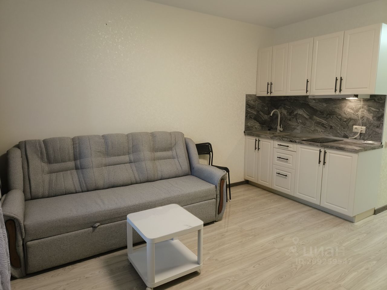 Студия оборудована новой мебелью: кухонным гарнитуром,двуспальным диваном, вместительным шкафом, прихожей.
