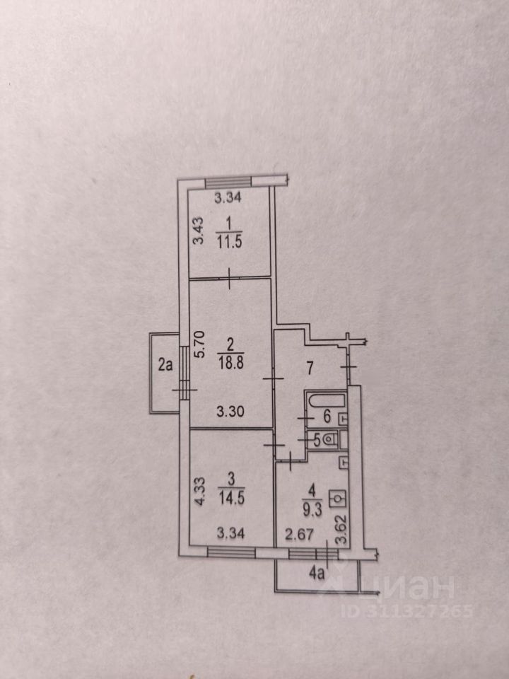Общая площадь 65 кв. м., кухня 9 кв. м, комнаты 14,5-18,8+11,5. Два балкона.