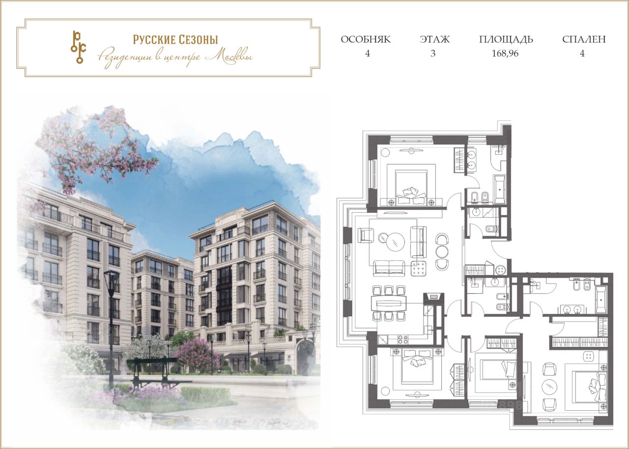 Продаётся просторная светлая квартира общей площадью 168,96 кв.м. Панорамные окна в пол, достигающие в высоту до 2,8 метров, открывают удивительные виды на внутренний парк комплекса с авторским дизайном, фонтаны и садовые группы. Южные окна квартиры обращены к Климентовскому переулку, в то время как из западных окон можно наслаждаться панорамами исторической Москвы и Церковью иконы Божией Матери. Большая площадь остекления, достигающая в некоторых проемах ширины 4 метра, позволяет стереть границы между внутренним и внешним пространством, усиливая связь интерьерного пространства с экстерьерным. В квартире просторная гостиная с панорамными окнами в пол объединена с кухней-столовой. Хозяйская зона отделена от гостевой. Имеются 2 детские спальни, гостевая спальня со своей ванной комнатой, а также шикарная хозяйская спальня с большой гардеробной и ванной комнатой. По запросу клиента планировка может быть изменена.