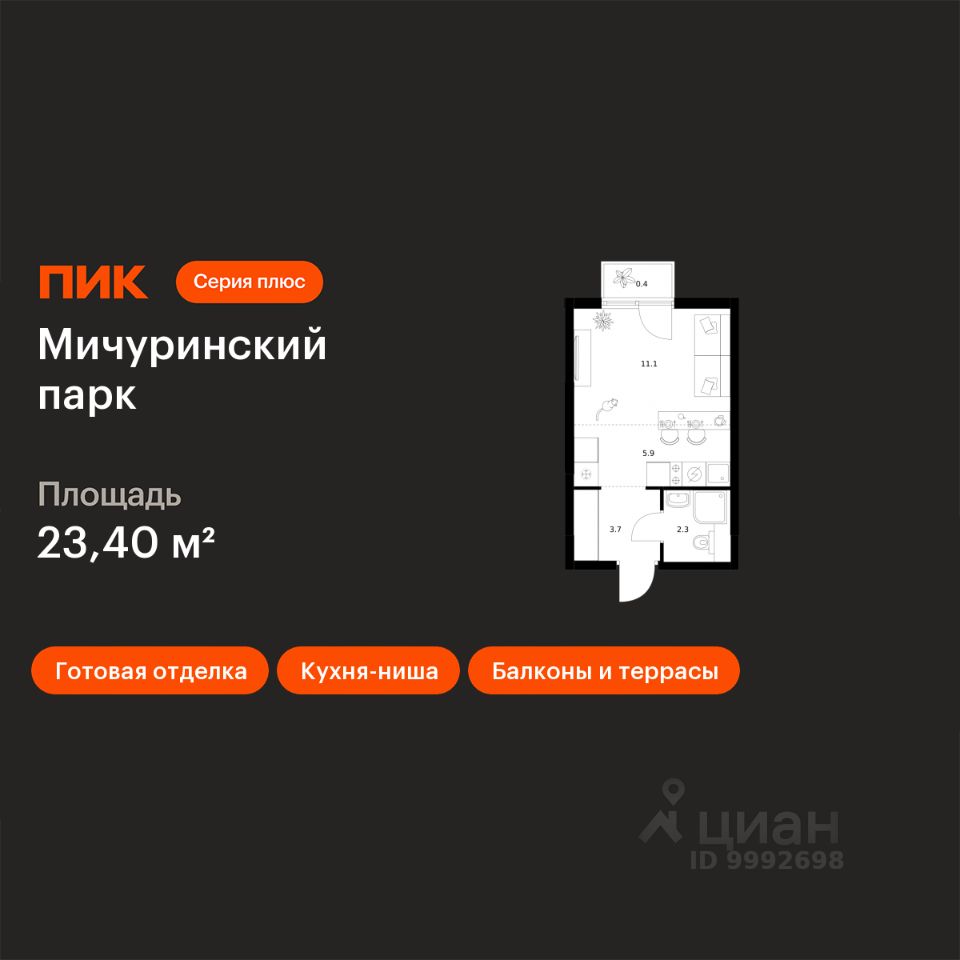 продам 1-к, Мичуринский Парк ЖК, 4.516 876 080 ₽