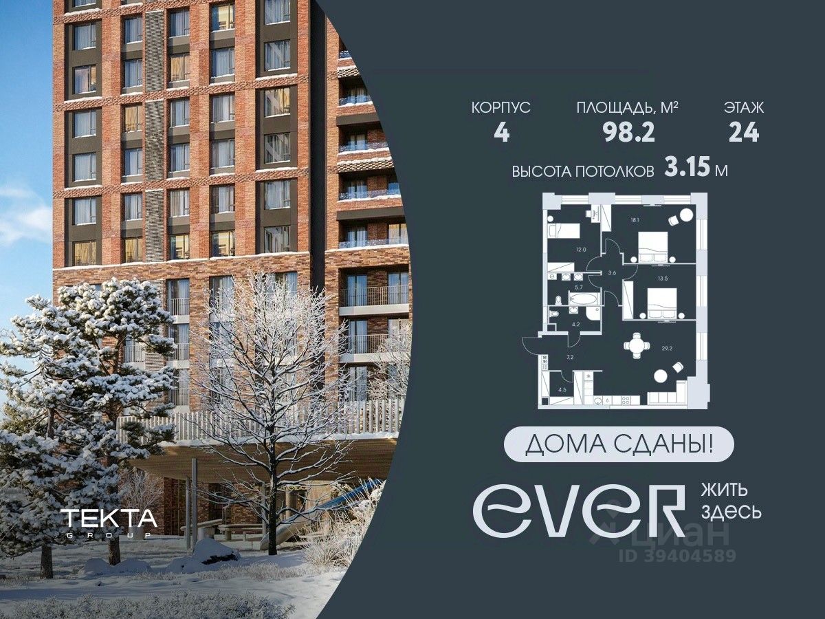 4-комн. квартира в ЖК ''Ever'' на 24 этаже в 34 этажном здании Корпус 4. Общая площадь: 98.2 кв.м., жилая: 62.6 кв.м. Высота потолков 3.15 м.