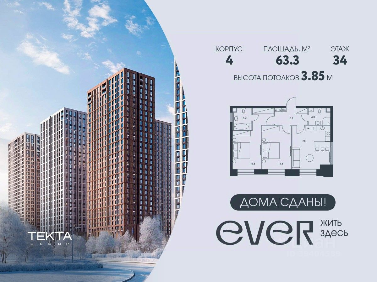 3-комн. квартира в ЖК ''Ever'' на 34 этаже в 34 этажном здании Корпус 4. Общая площадь: 63.3 кв.м., жилая: 40.1 кв.м. Высота потолков 3.85 м.