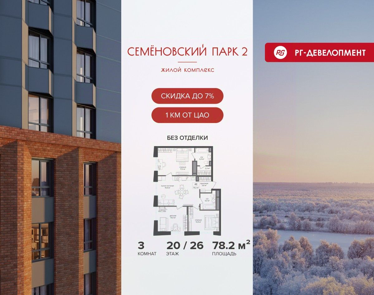 Продается 3-к квартира 78,2 кв.м. в ЖК ''Семеновский парк 2'' на 20-м этаже 26 этажного дома.