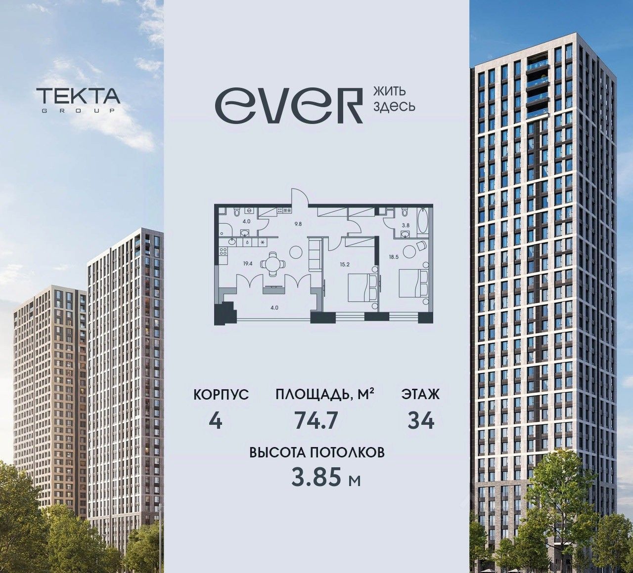 3-комн. квартира в ЖК ''Ever'' на 34 этаже в 34 этажном здании Корпус 4. Общая площадь: 74.8 кв.м., жилая: 45.7 кв.м. Высота потолков 3.85 м.