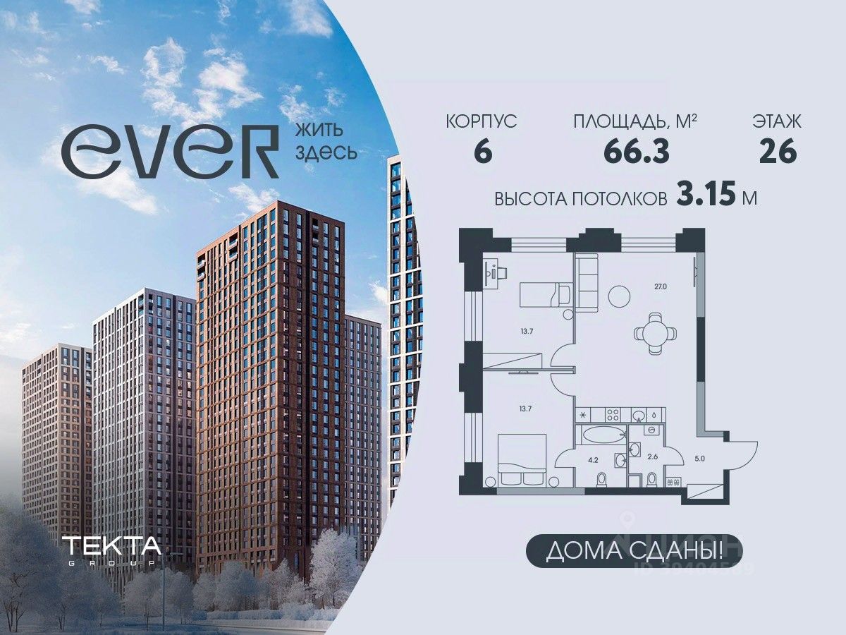 3-комн. квартира в ЖК ''Ever'' на 26 этаже в 34 этажном здании Корпус 6. Общая площадь: 66.3 кв.м., жилая: 42.7 кв.м. Высота потолков 3.15 м.