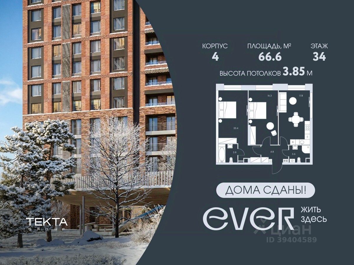 3-комн. квартира в ЖК ''Ever'' на 34 этаже в 34 этажном здании Корпус 4. Общая площадь: 66.6 кв.м., жилая: 48.1 кв.м. Высота потолков 3.85 м.