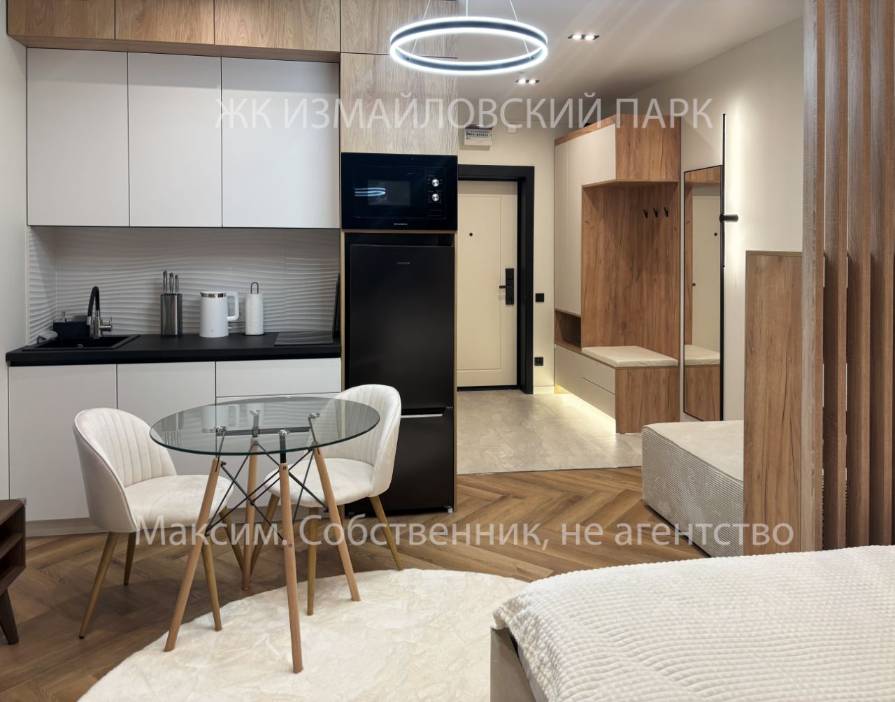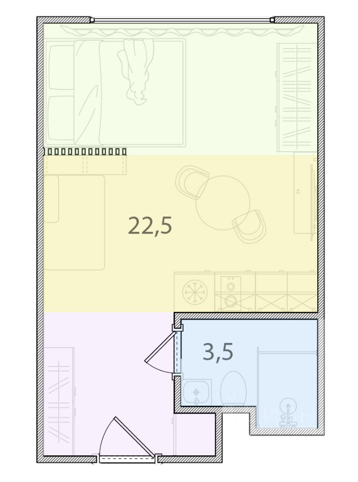 Квартира отлично сбалансирована по планировке - зонирование зон спальни, места готовки и прихожей, что позволит ощущать себя в более комфортном пространстве, чем можно предположить по ''классическим'' студиям.