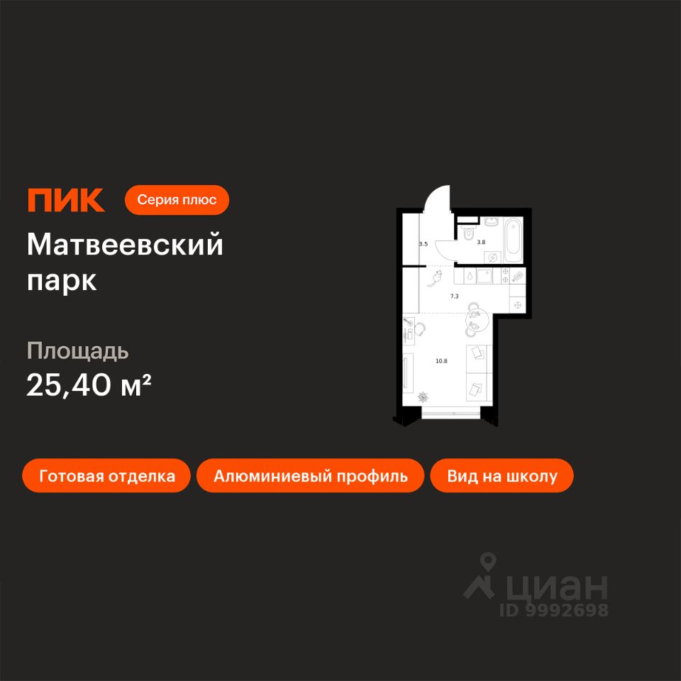 Продаётся квартира-студия площадью 25,4 кв.м на 22 этаже 26 этажного дома (Корпус 4.1, Секция 1) проекта ПИК Матвеевский парк. Светлый просторный подъезд на уровне земли, функциональная планировка, большие окна, c отделкой.