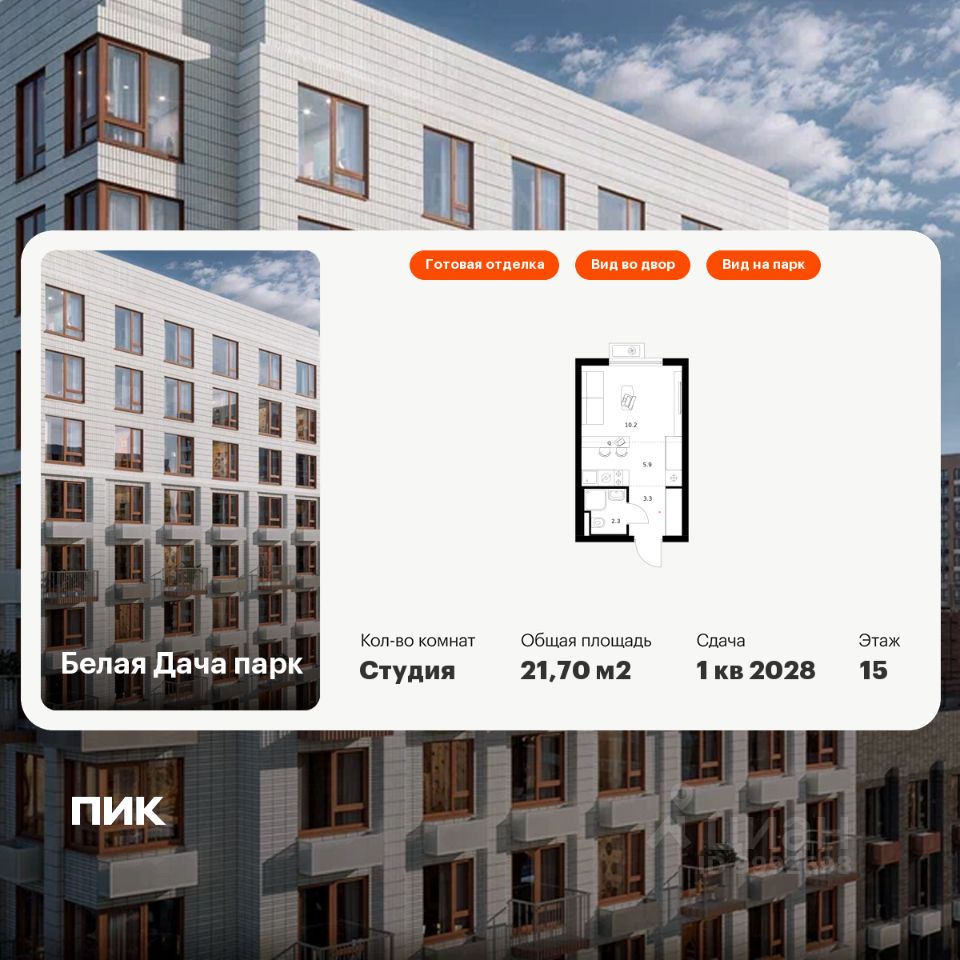 Продаётся квартира-студия площадью 21,7 кв.м на 15 этаже 15 этажного дома (Корпус 16.2, Секция 6) проекта ПИК Белая Дача парк. Светлый просторный подъезд на уровне земли, функциональная планировка, большие окна, c отделкой.