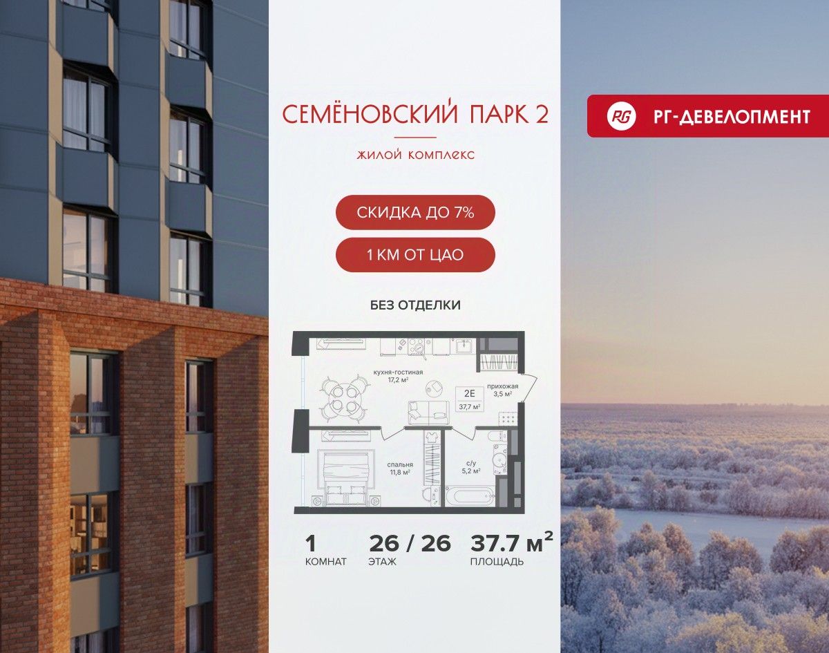 Продается 1-к квартира 37,7 кв.м. в ЖК ''Семеновский парк 2'' на 26-м этаже 26 этажного дома.