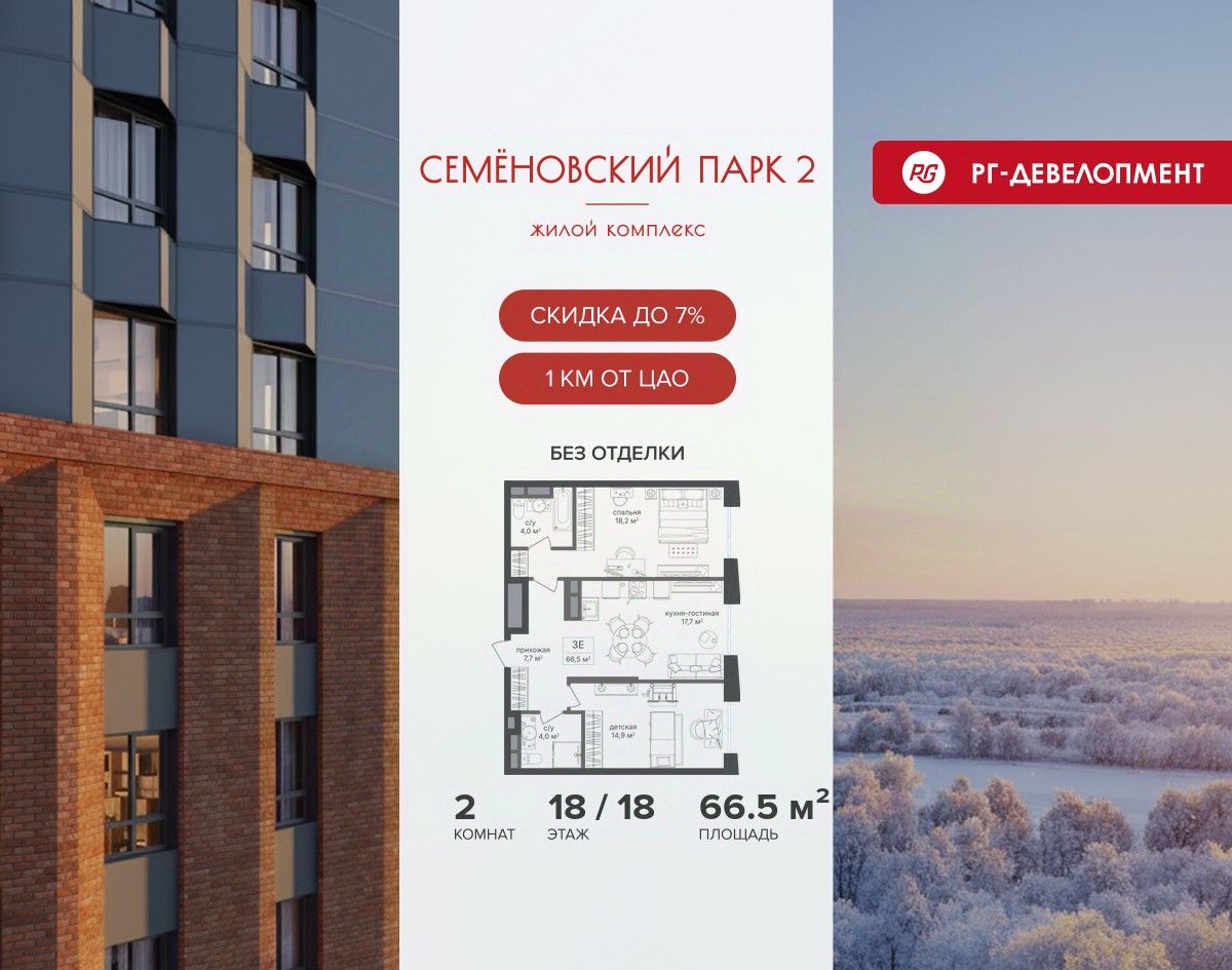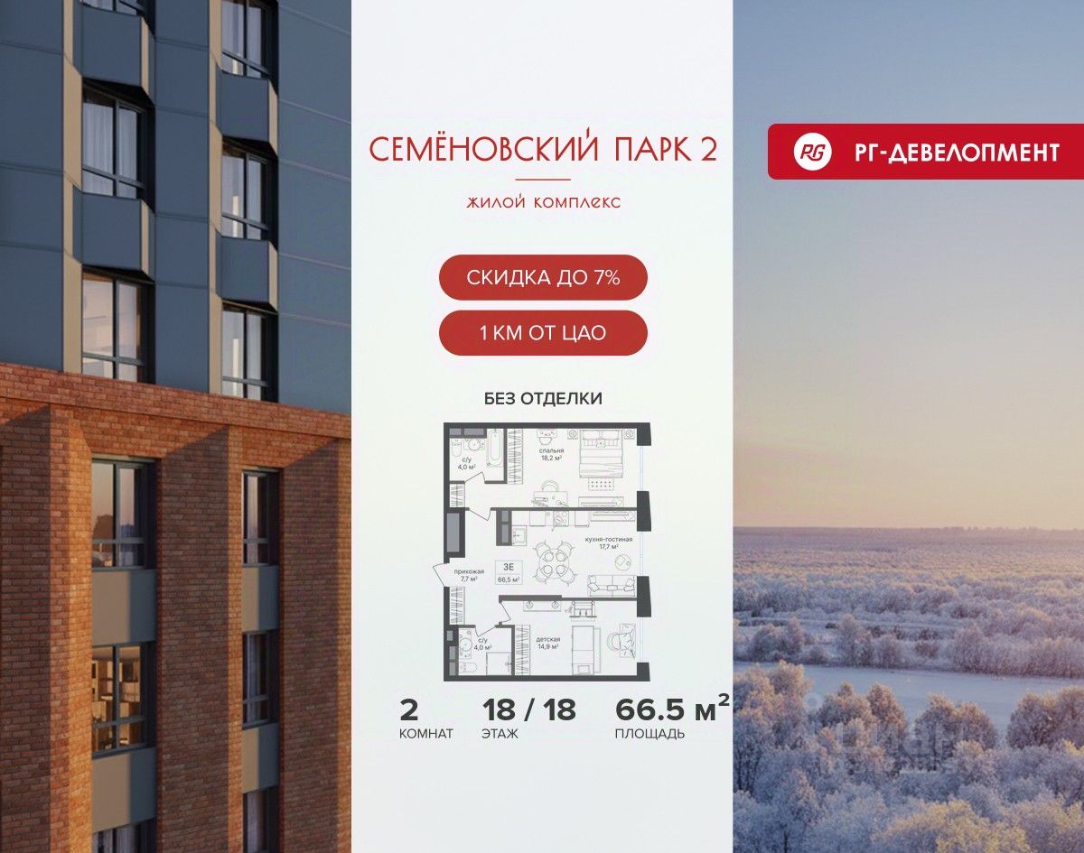 Продается 2-к квартира 66,5 кв.м. в ЖК ''Семеновский парк 2'' на 18-м этаже 18 этажного дома.