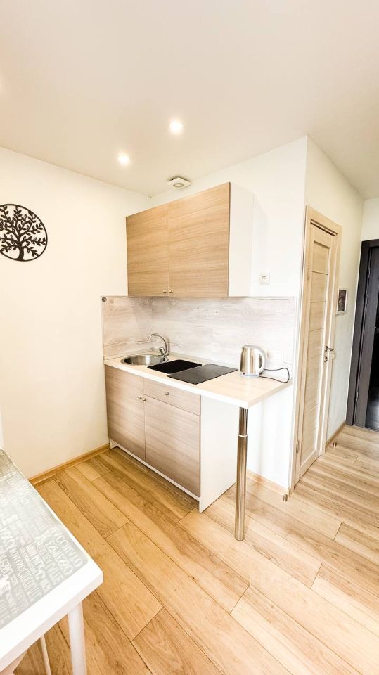 * Современный дизайнерский ремонт. Это не просто ''бабушкины'' обои в цветочек, а новые чистые стены, стильная отделка с грамотно расставленными акцентами. * Полный комплект мебели: двуспальная кровать, стол, стулья, кухонный гарнитур и т.д. * Ортопедический матрас для удобного отдыха. * Бытовая техника: варочная панель, холодильник, микроволновка, стиральная машина, телевизор, Wi-Fi.