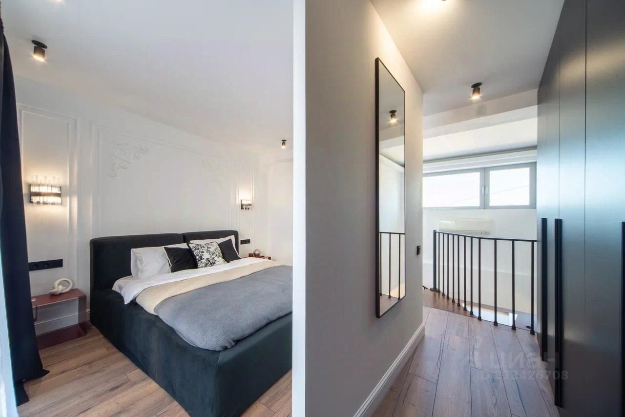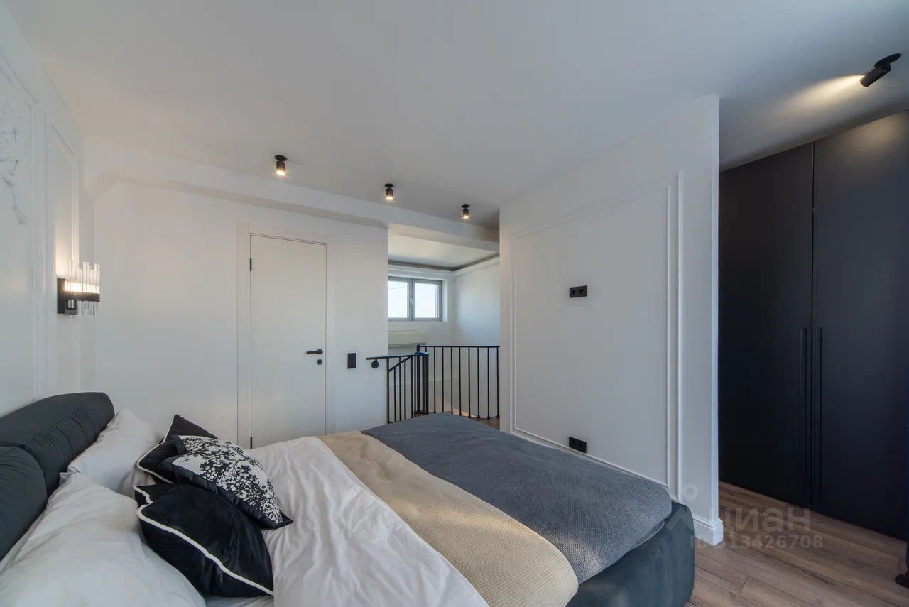 На втором приватная спальня с гардеробной зоной и ванной комнатой. В спальне панорамные окна и выход на оборудованную террасу с видами на старую Москву.