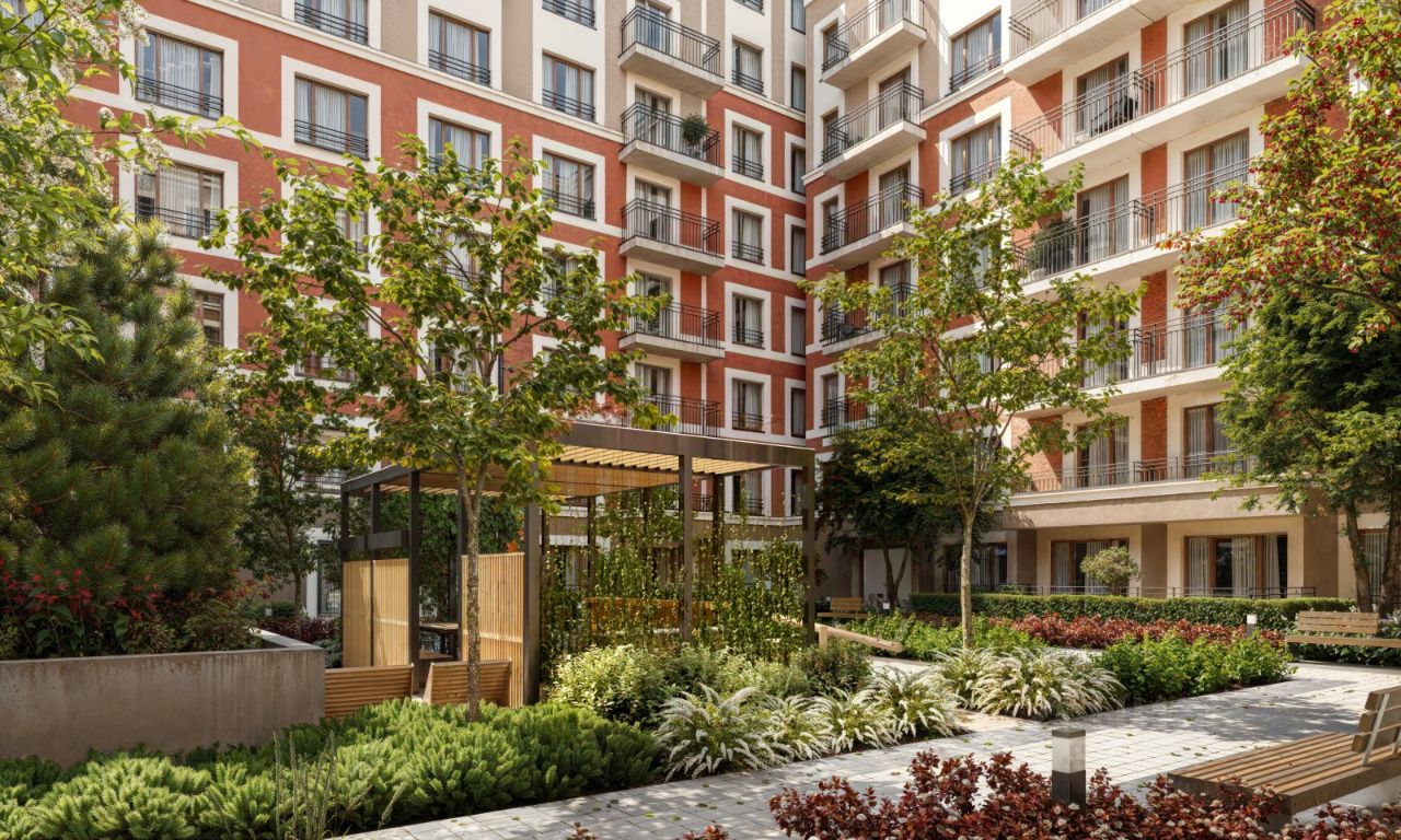 Двор с выходом в сквер Двор - это приватное пространство для жителей, закрытое от машин. В нём спроектированы детская и спортивная площадки, выполненные из натуральных материалов, а также зоны отдыха. Прямой выход в городской сквер расширяет функционал двора. Жители смогут быстро попадать в общественную зону с фонтаном, детскими и спортивными площадками и местами для отдыха. Большую часть территории двора занимает зелень. Озеленение выполнено в стиле пэчворк, и вдохновлено техникой лоскутного шитья. Отдельные фрагменты ландшафта, подобно лоскутам, гармонично складываются в планировочные элементы, а затем формируют цельную композицию. Растения представлены различными видами