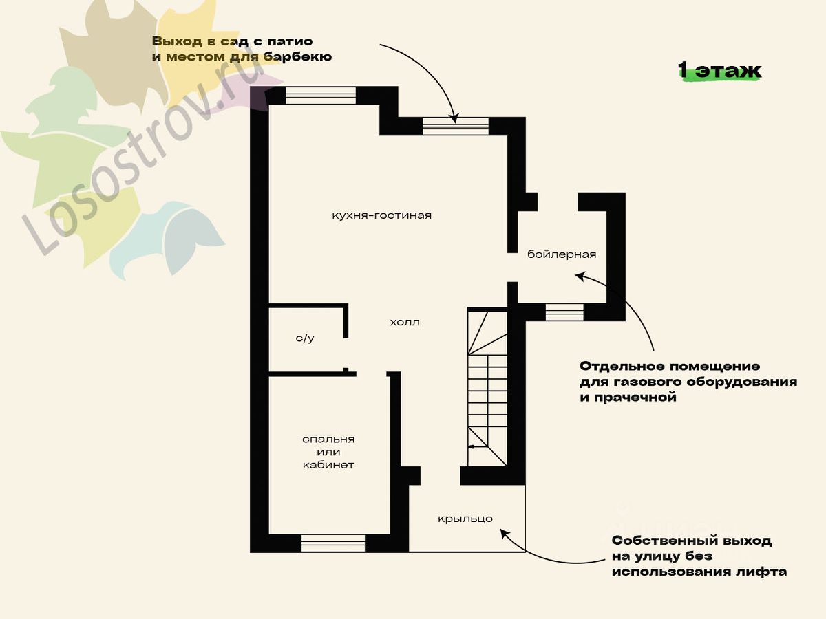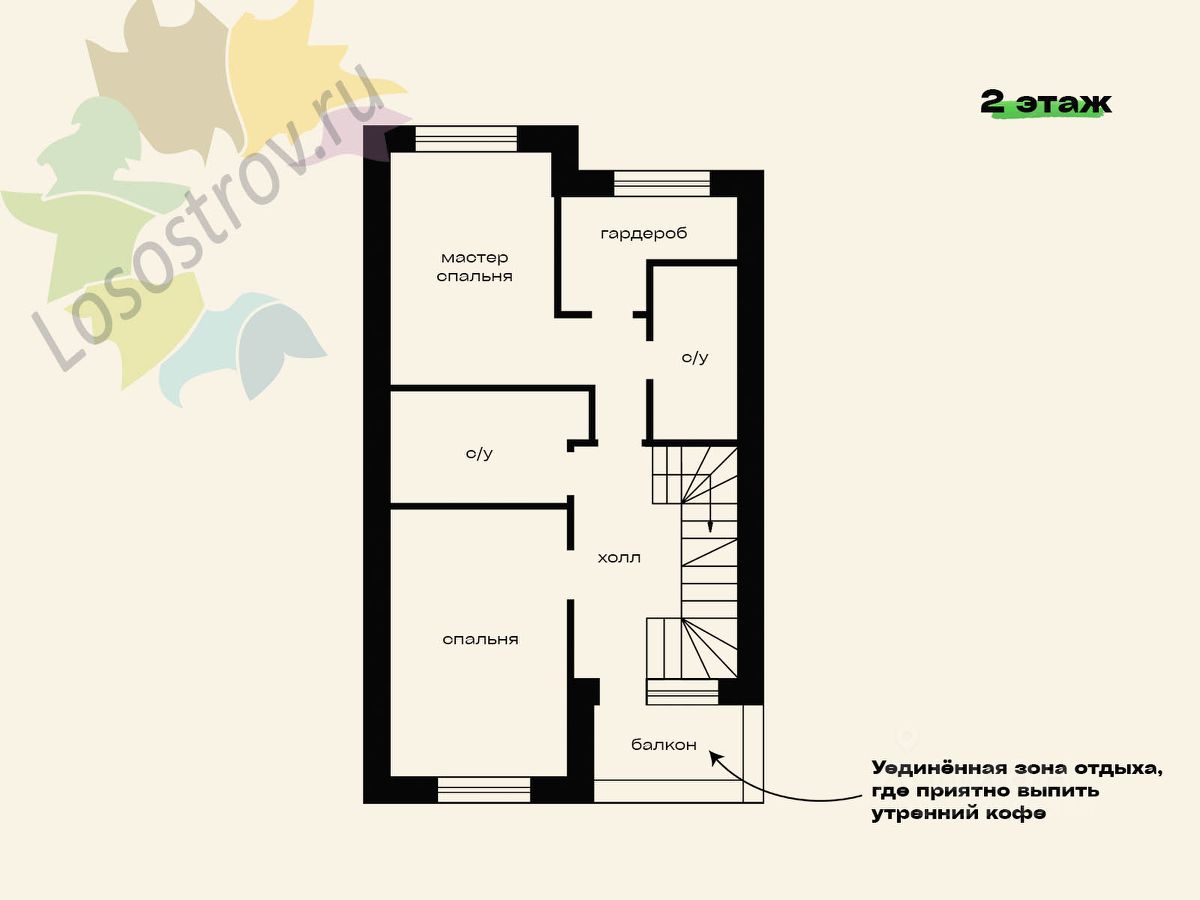 Возможная планировка: на первом этаже: прихожая, спальня, гардеробная, с/у, кухня-гостиная, котельная, на втором этаже: 2 спальни, гардероб, балкон, с/у, коридор.