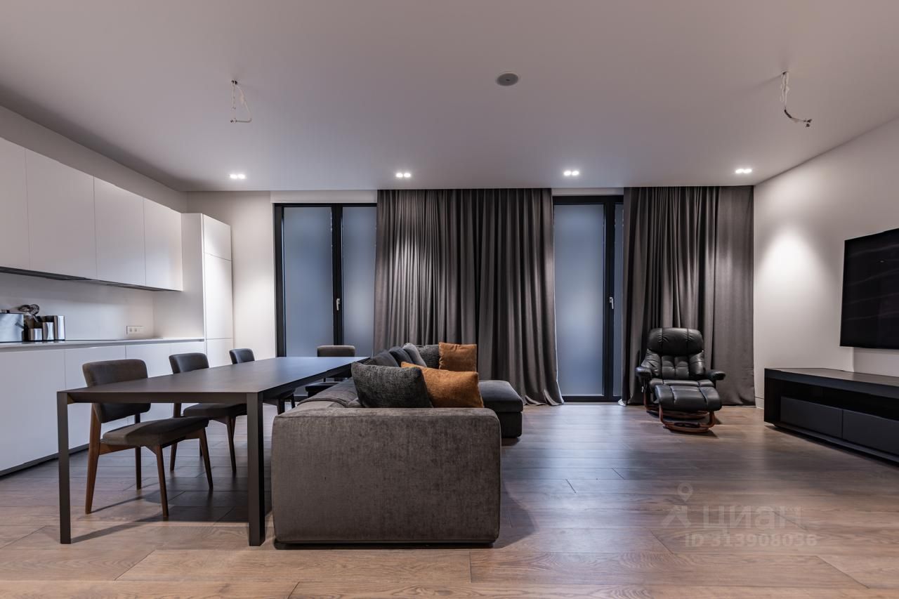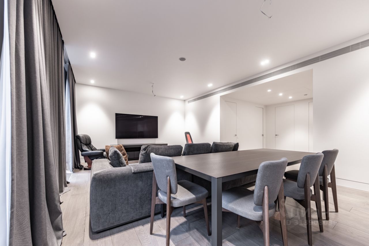 Интерьер выполнен с использованием мрамора и ценных пород дерева, что придает пространству особую элегантность и статус. Кухня оснащена встроенной техникой от ведущих мировых брендов Miele и Rossana, обеспечивая удобство и функциональность. Особое внимание заслуживает оформление ванных комнат: стены и полы облицованы мрамором Pietra Grey, установлены сантехнические изделия от Villeroy&Boch и Gessi, гарантирующие долговечность и эстетичность.