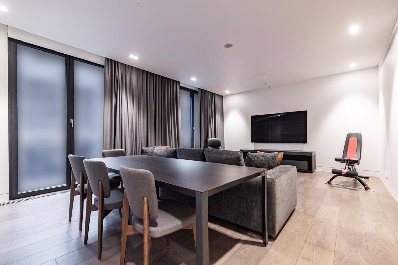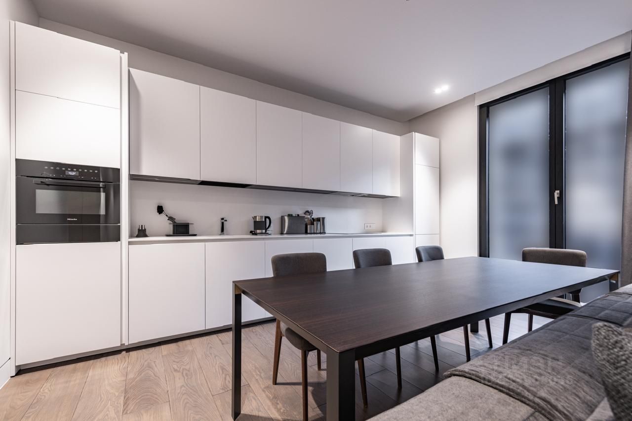 Интерьер выполнен с использованием мрамора и ценных пород дерева, что придает пространству особую элегантность и статус. Кухня оснащена встроенной техникой от ведущих мировых брендов Miele и Rossana, обеспечивая удобство и функциональность.