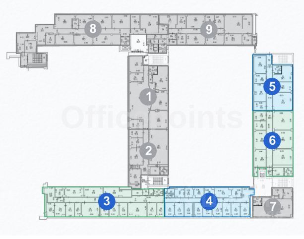 Помещение с отделкой, открытая планировка (open space). Приточно-вытяжная система вентиляции, центральная система кондиционирования. Наземная парковка.