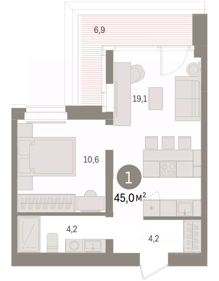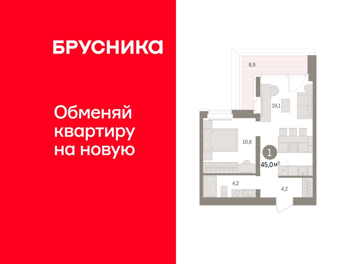 Квартира с кухней-гостиной и одной спальней в кварталах ''На Минской''. Особенности планировки: предчистовая отделка. квартиры в нашей базе: МНС01-Ж1.8.7.